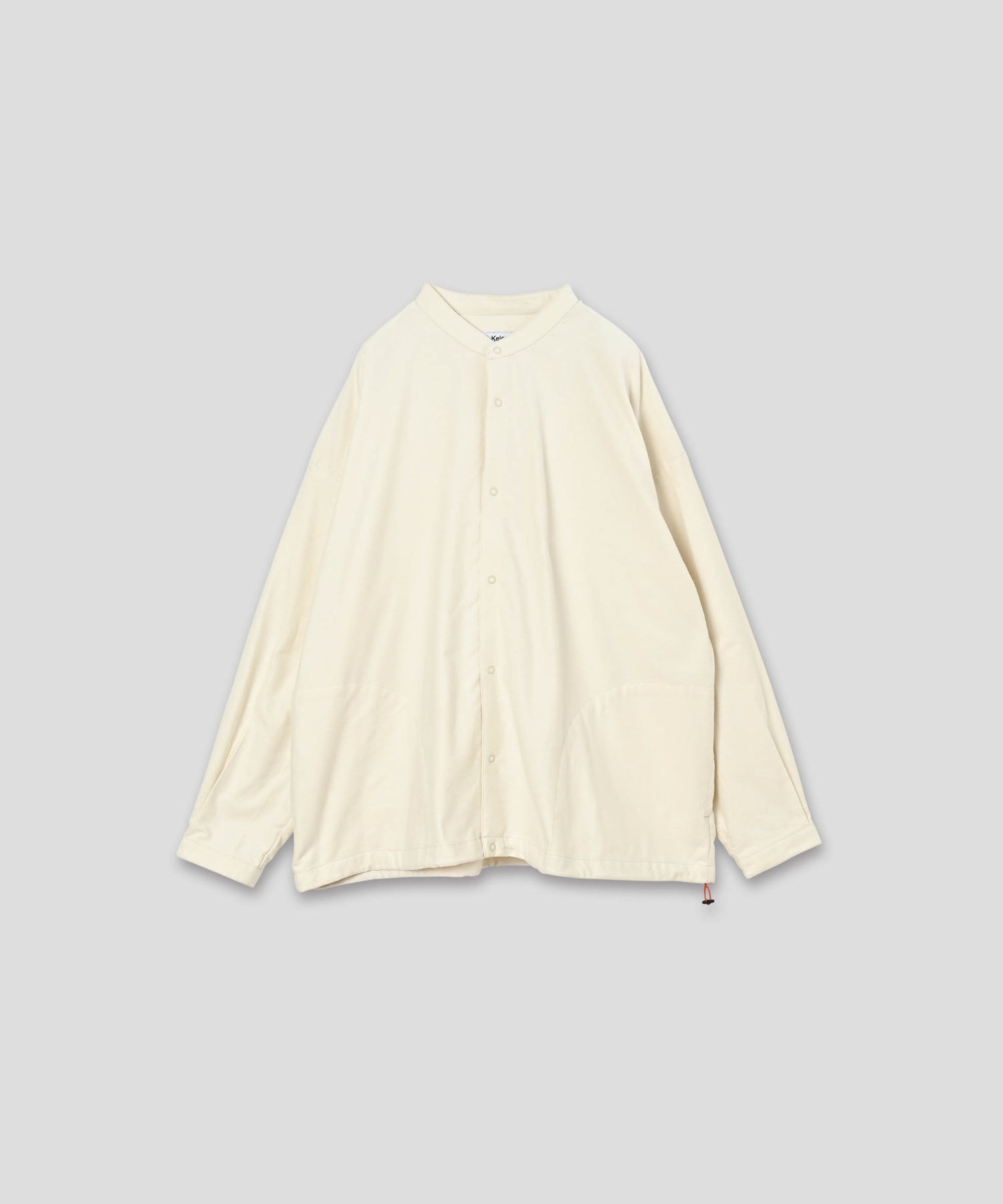 ワイドな身幅のボックスシルエットのバンドカラーシャツ。