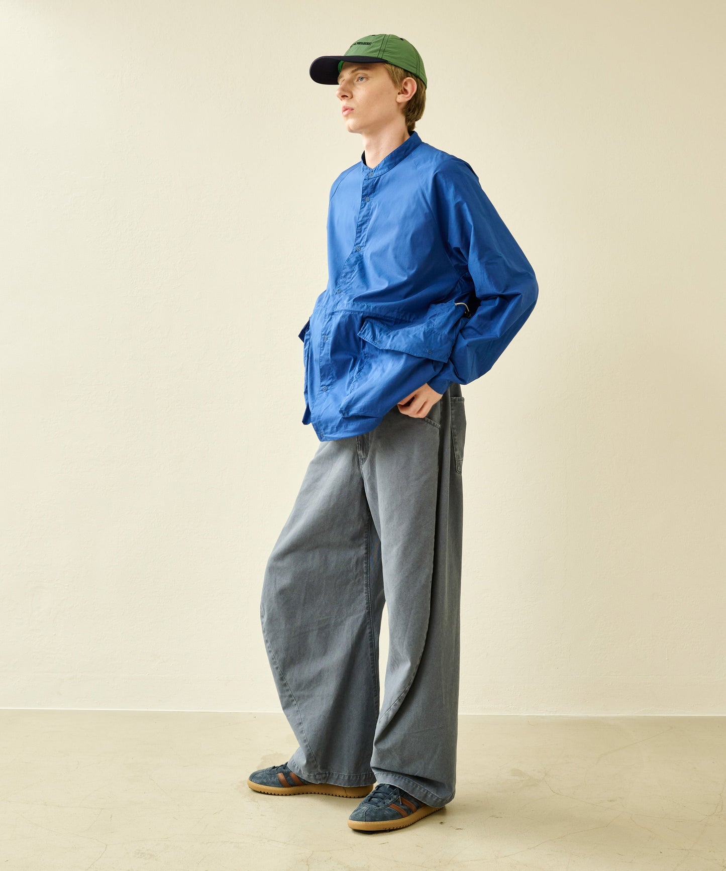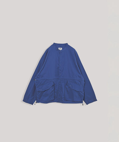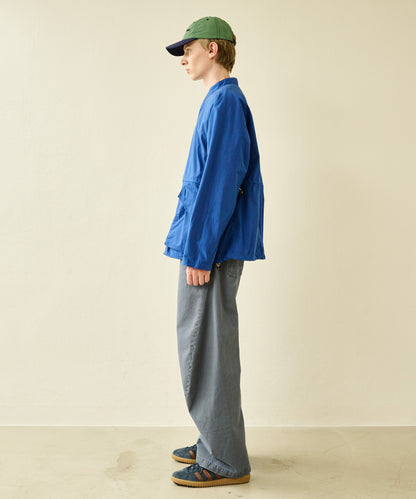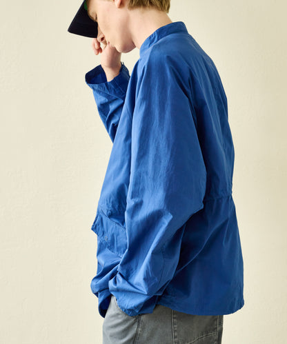 バンドカラーのスッキリとした印象とミリタリーテイストのあるフラップ付きのチェストポケットの対比がポイント。