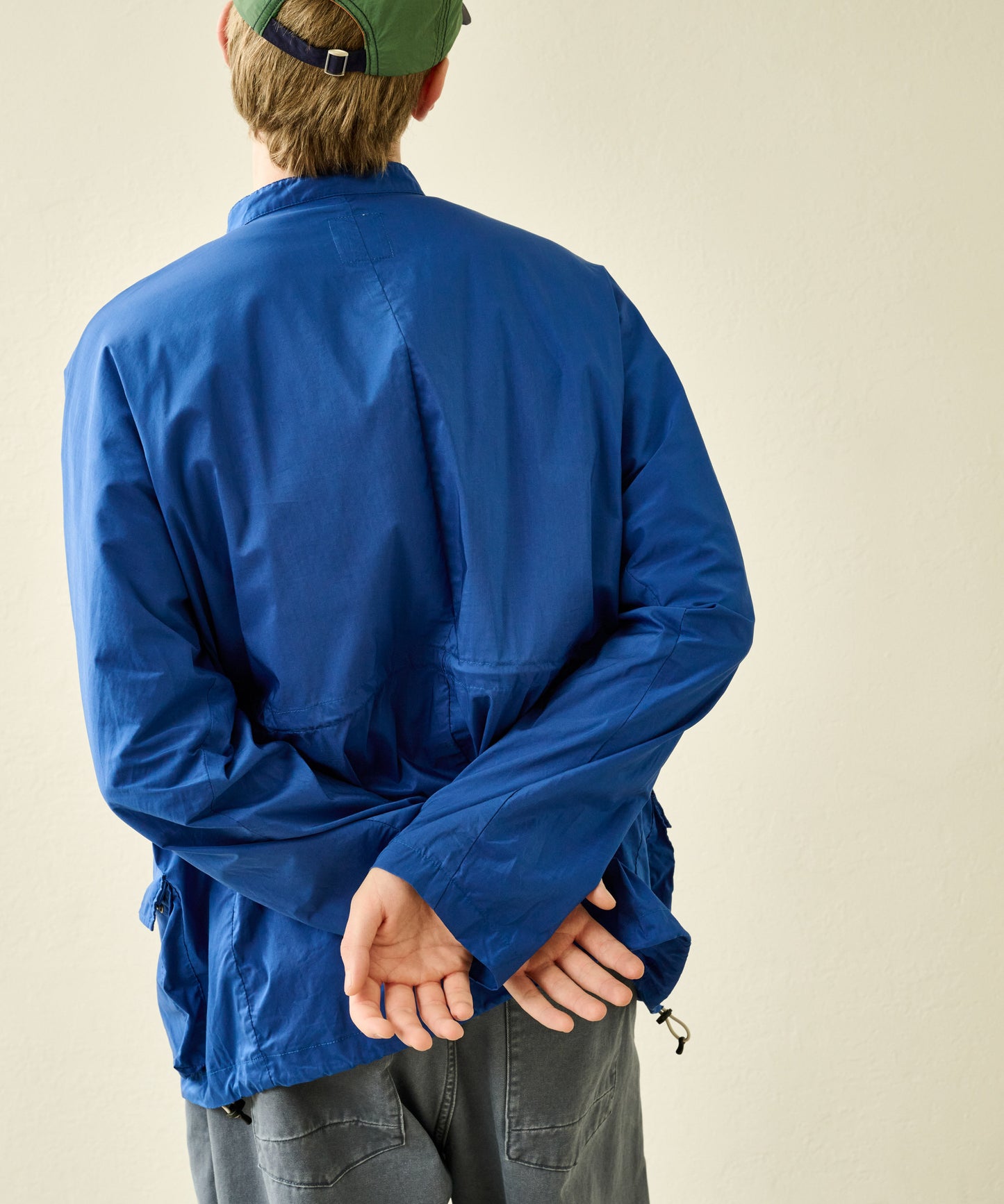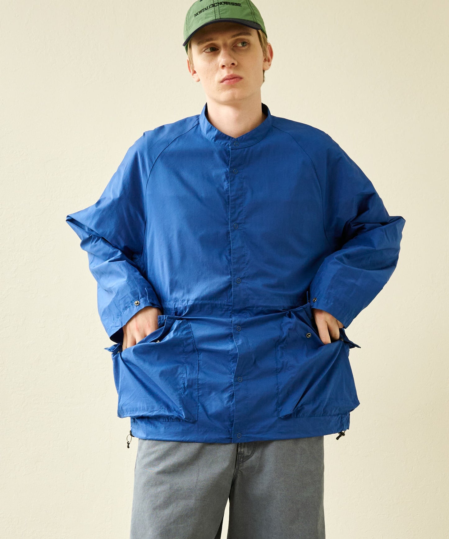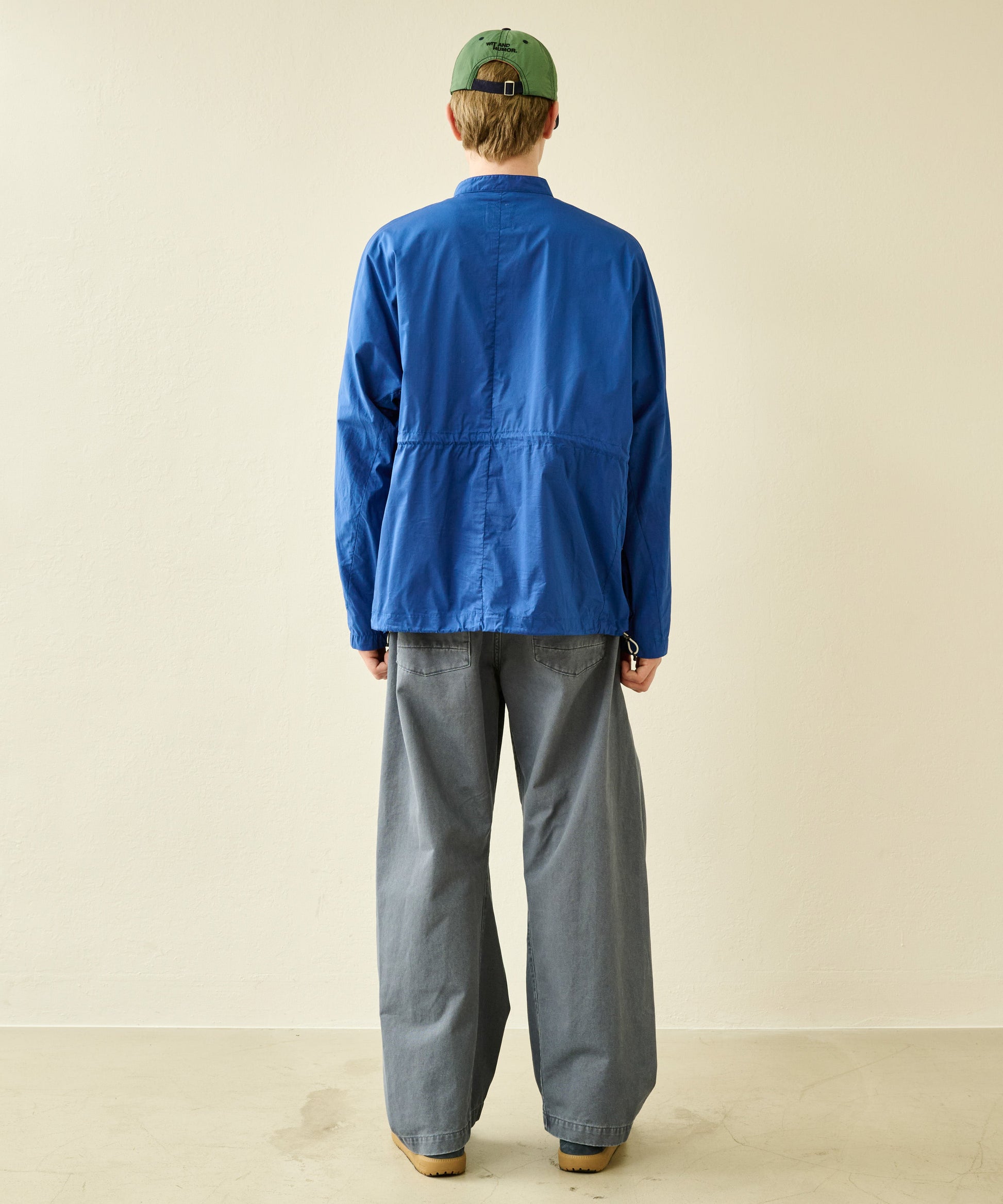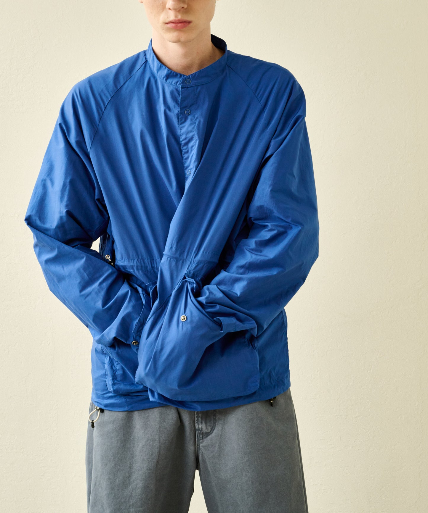 大きめのボックスシルエットサイズは裾を絞って着用が可能なドロスト付き。