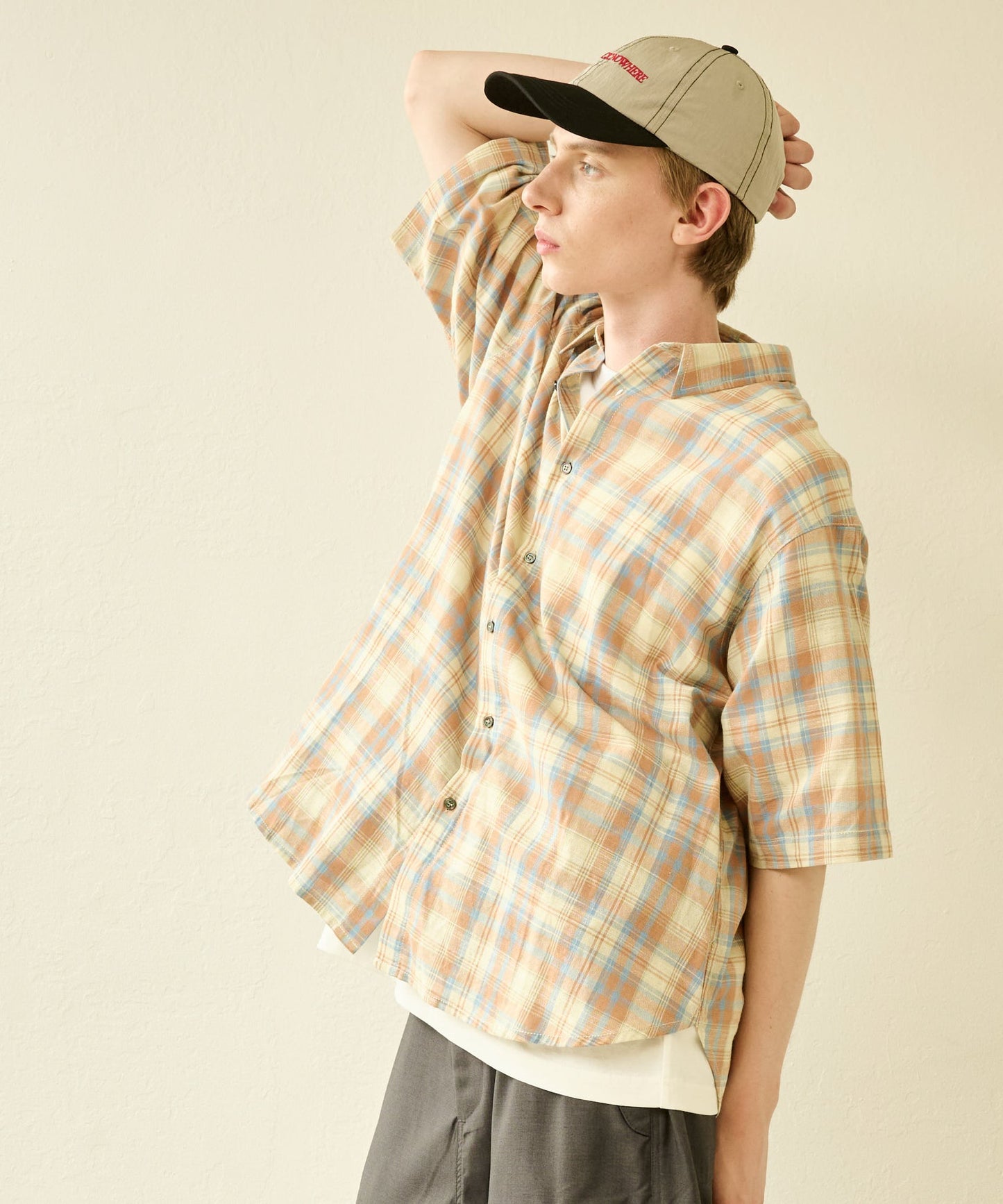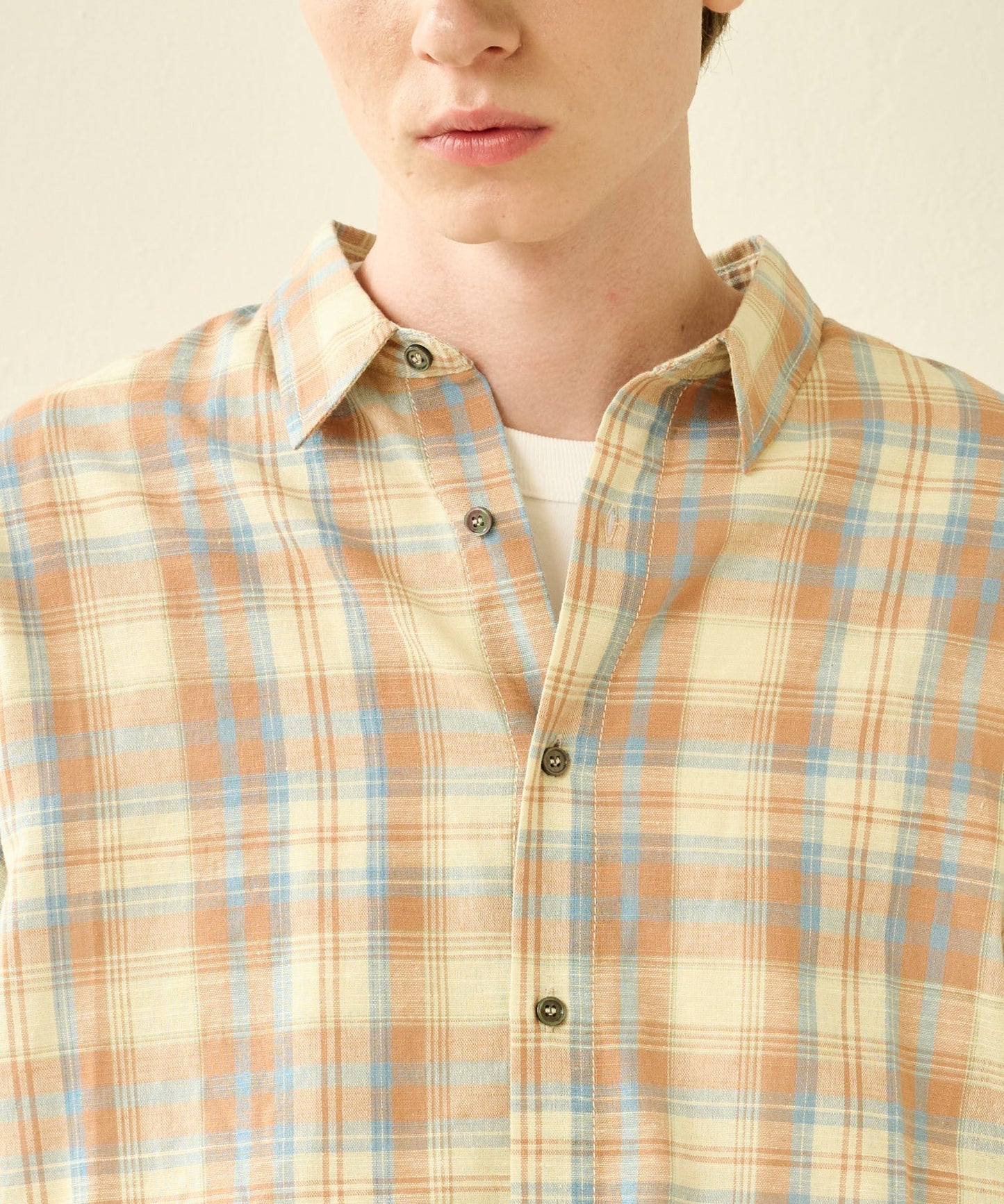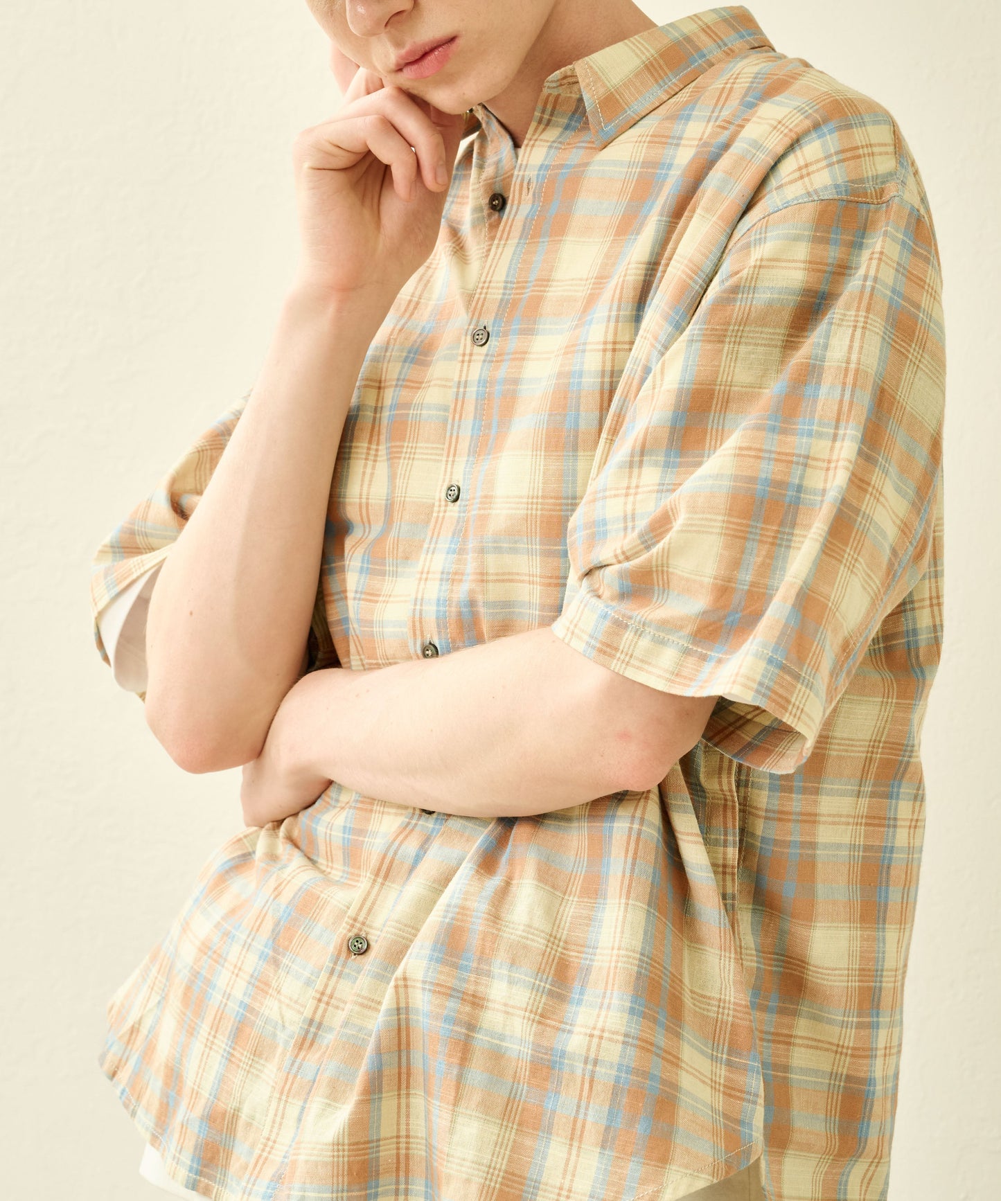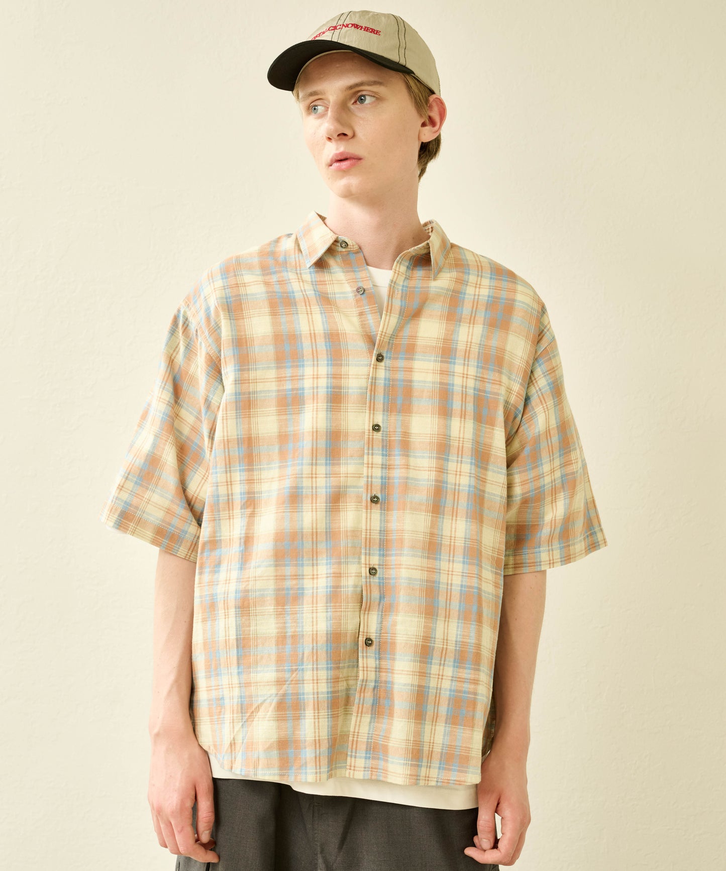 ショートスリーブのチェックと無地の2素材で展開したシャツ。