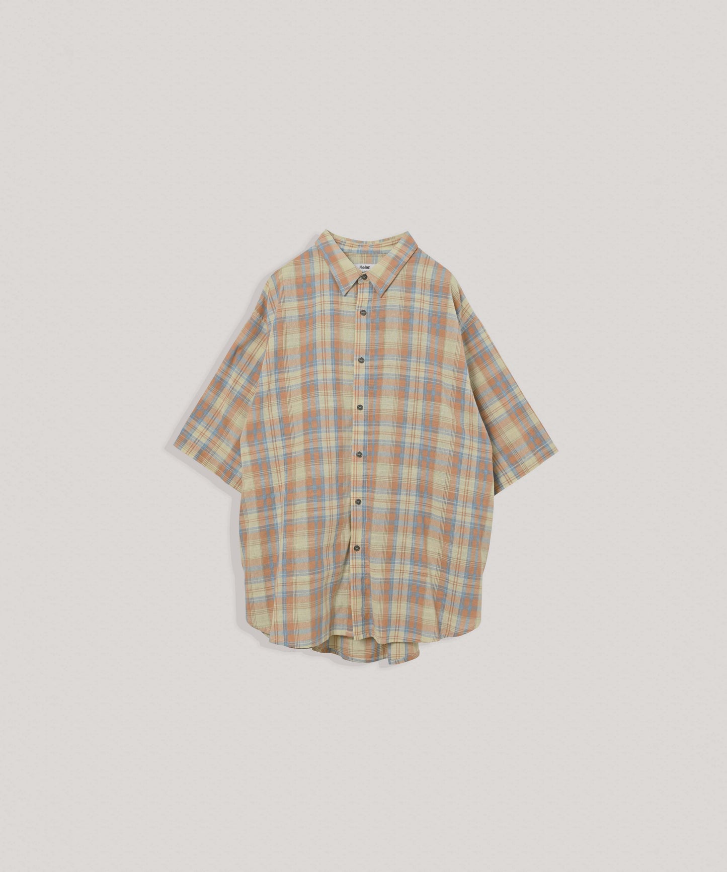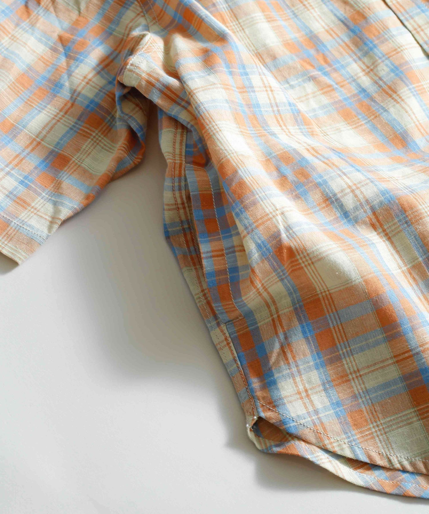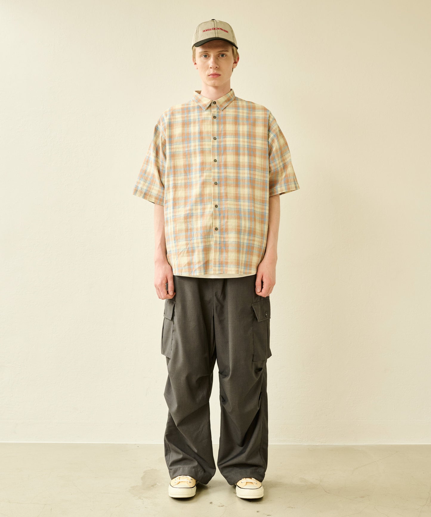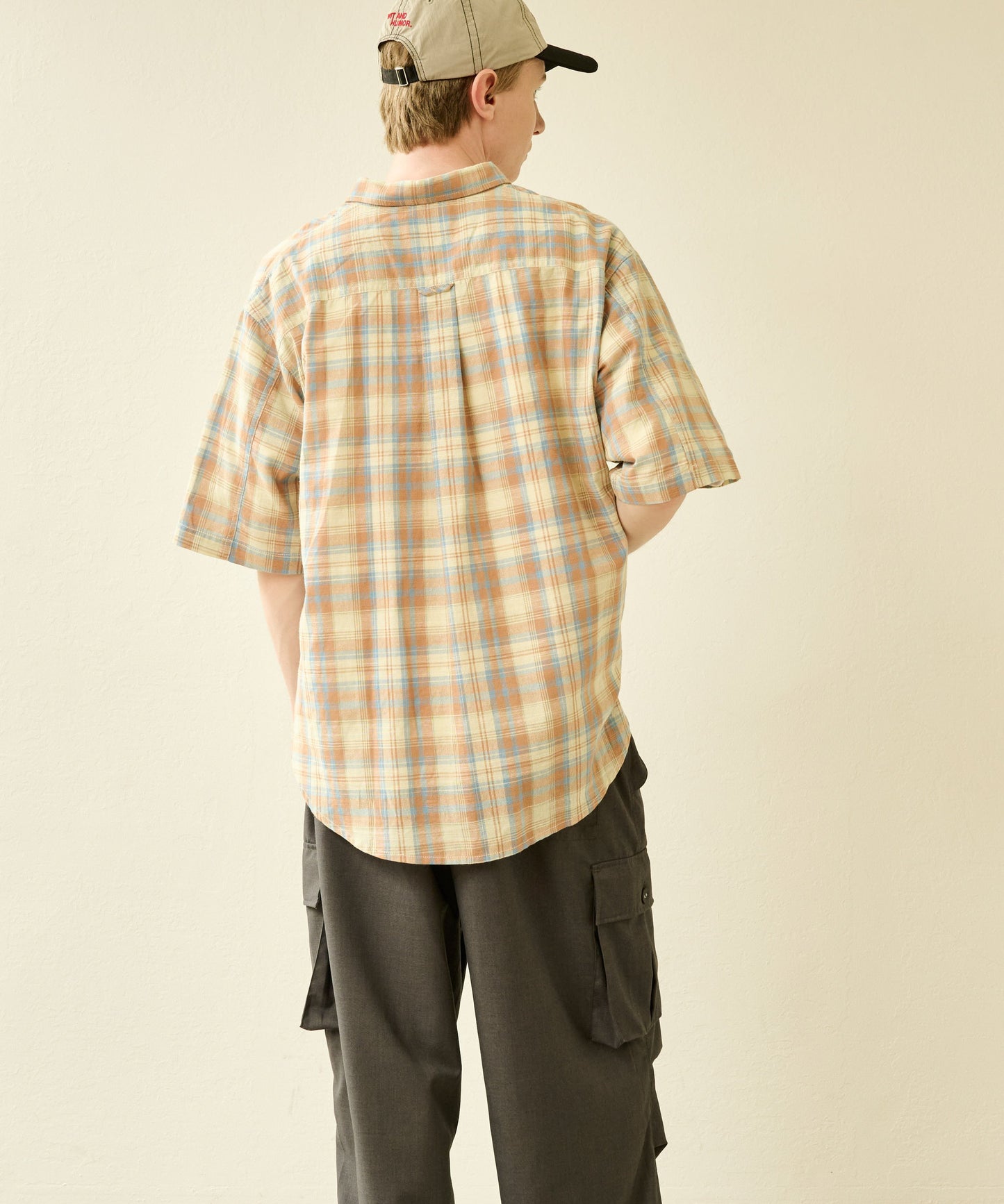 ショートスリーブのチェックと無地の2素材で展開したシャツ。