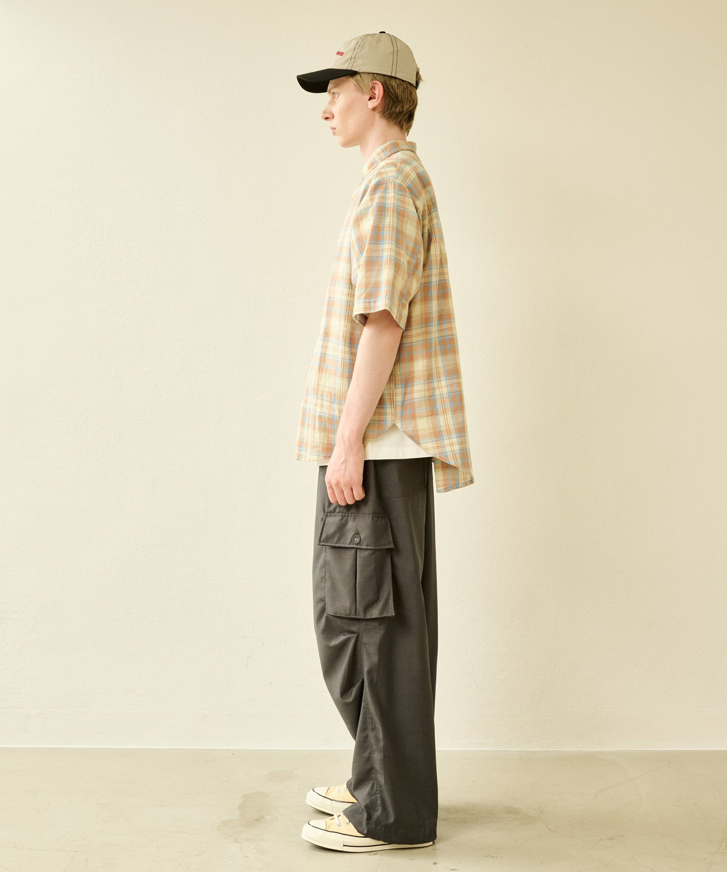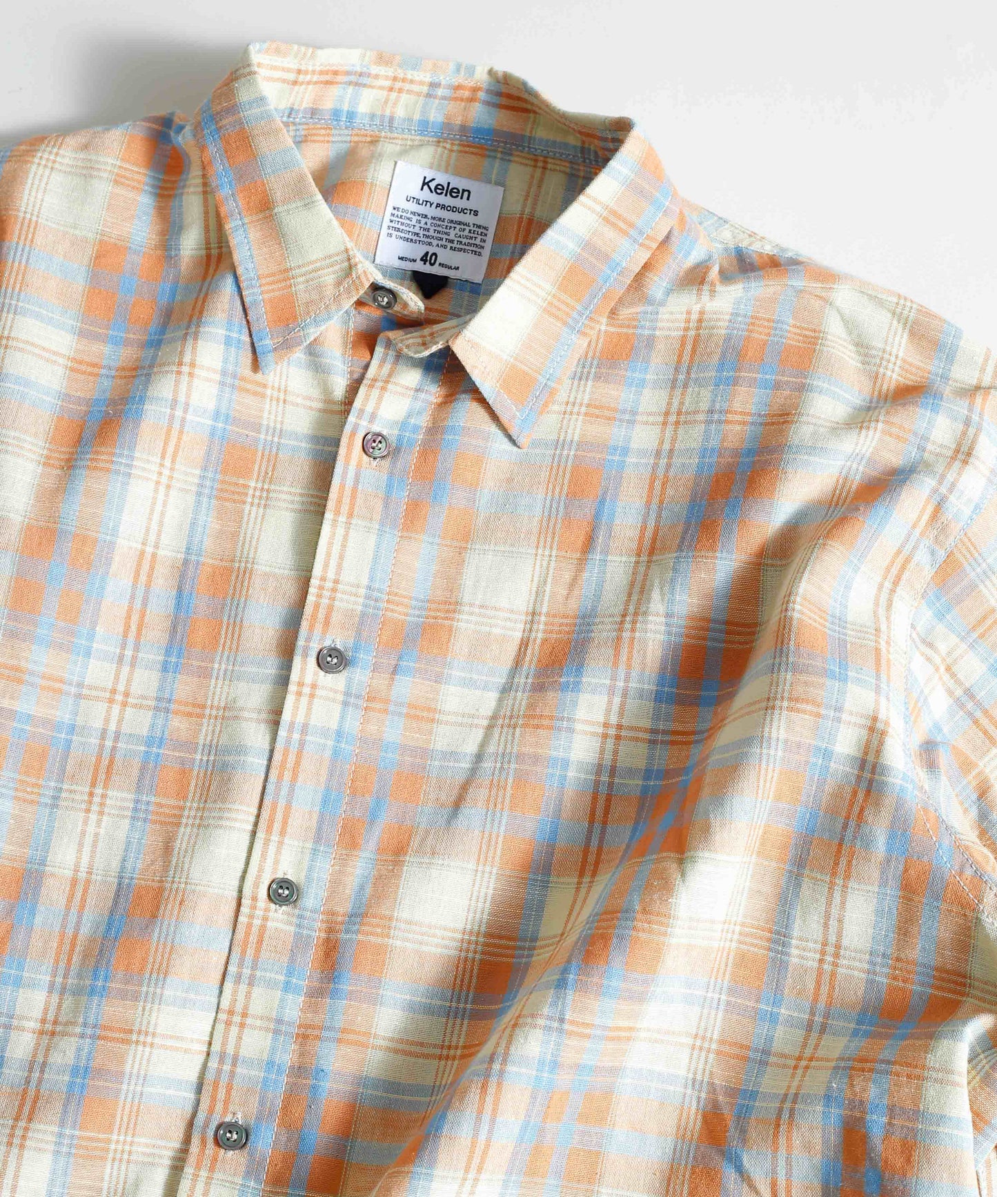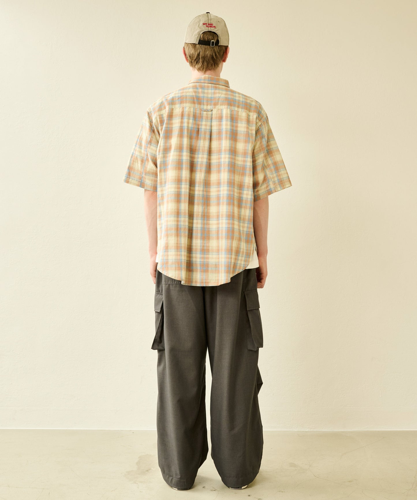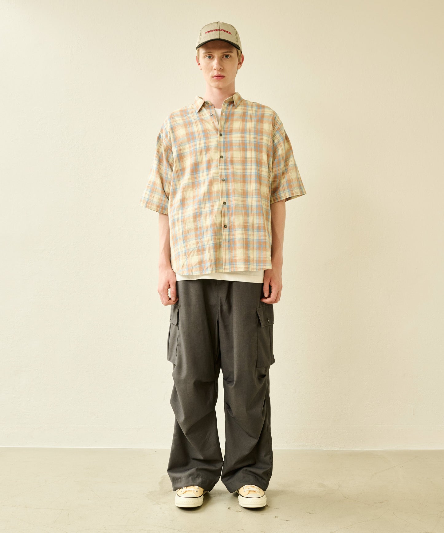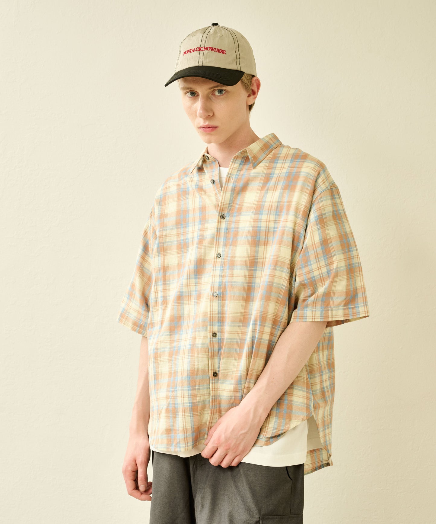 ショートスリーブのチェックと無地の2素材で展開したシャツ。