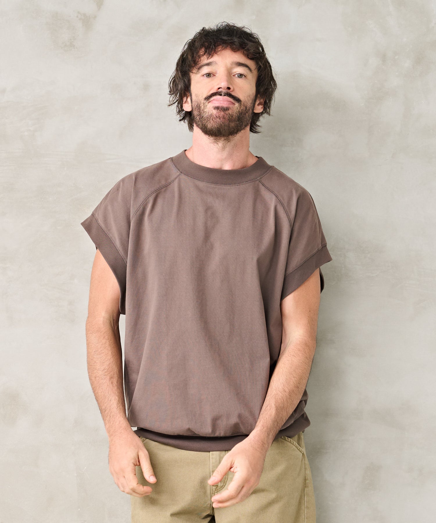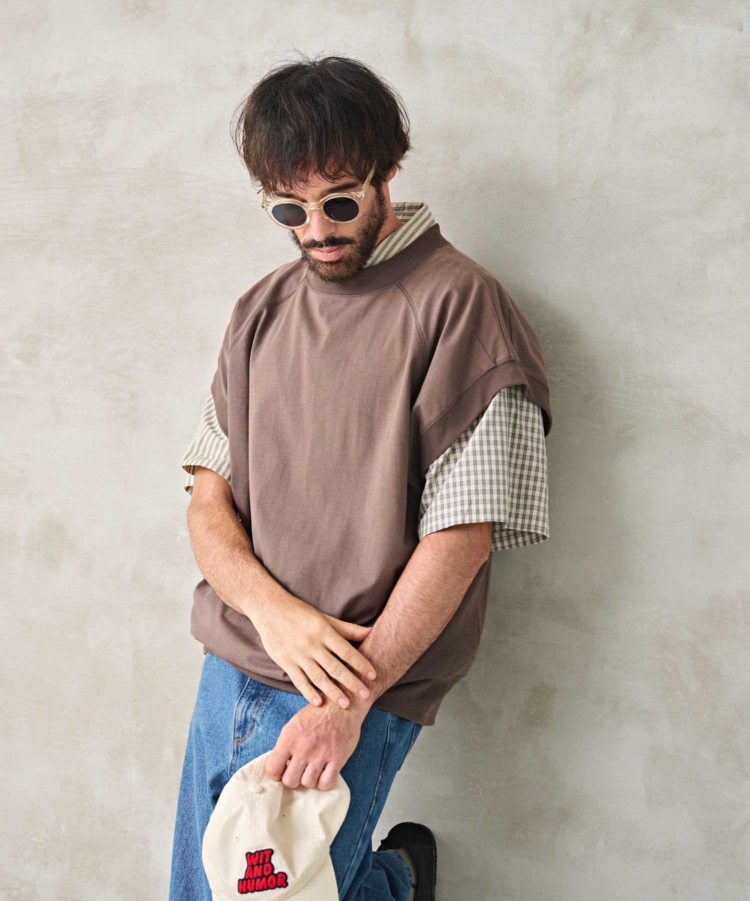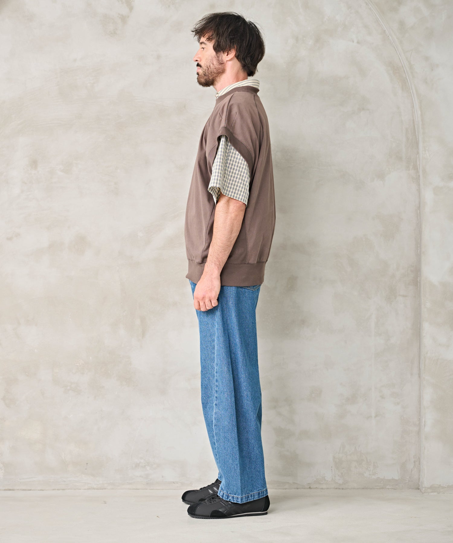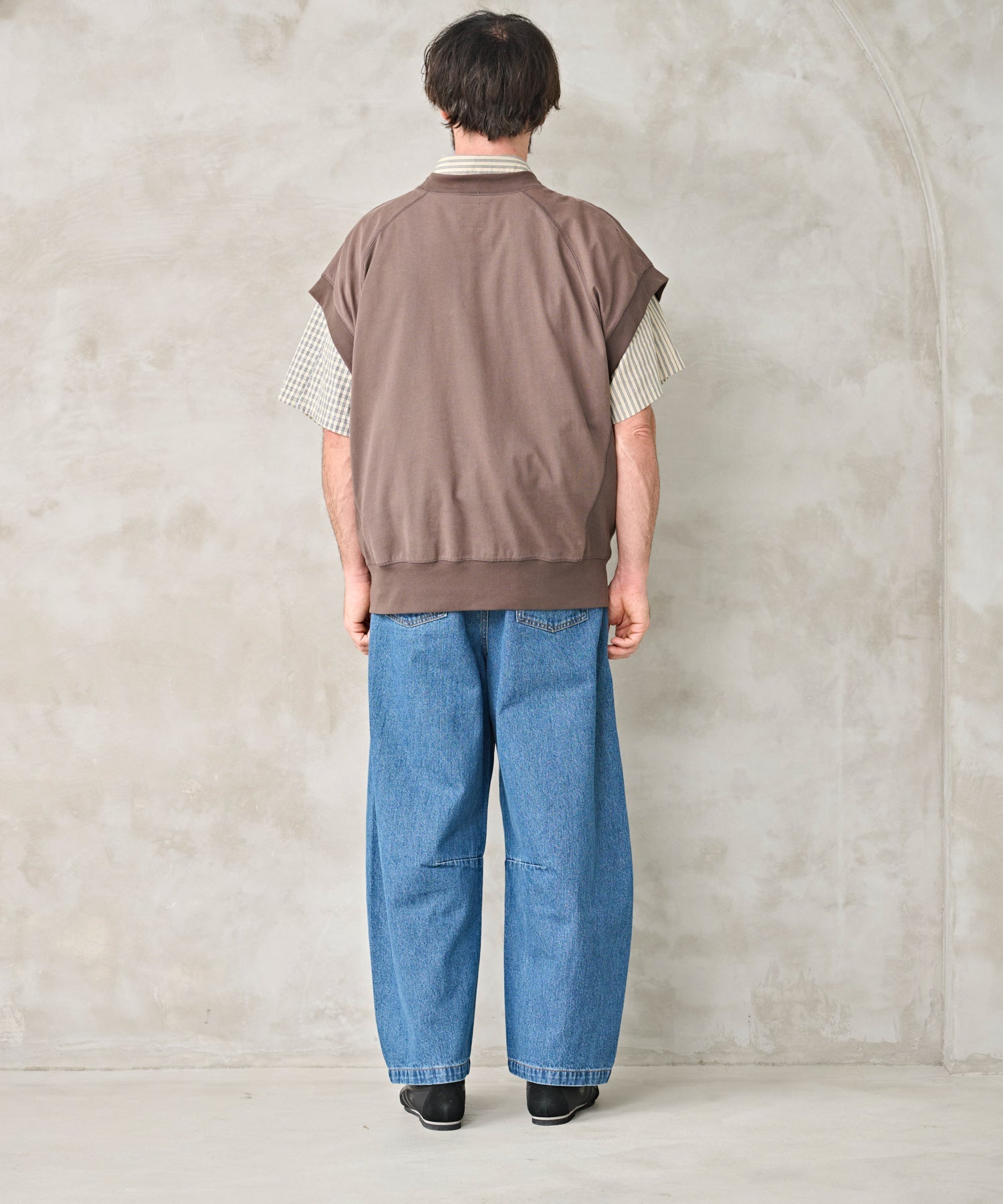 シャツや半袖のトップスにジレのようにスタイリングが可能。