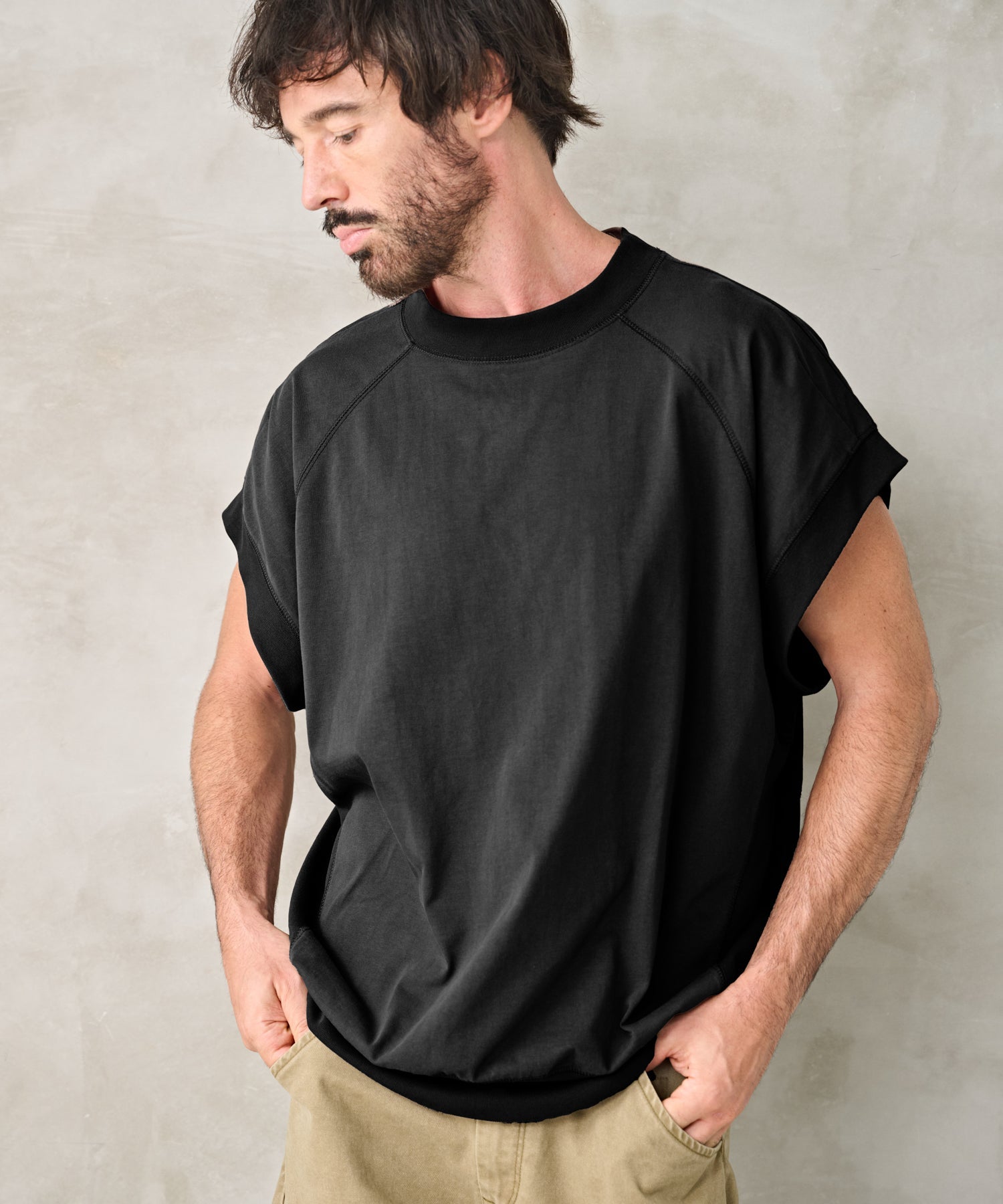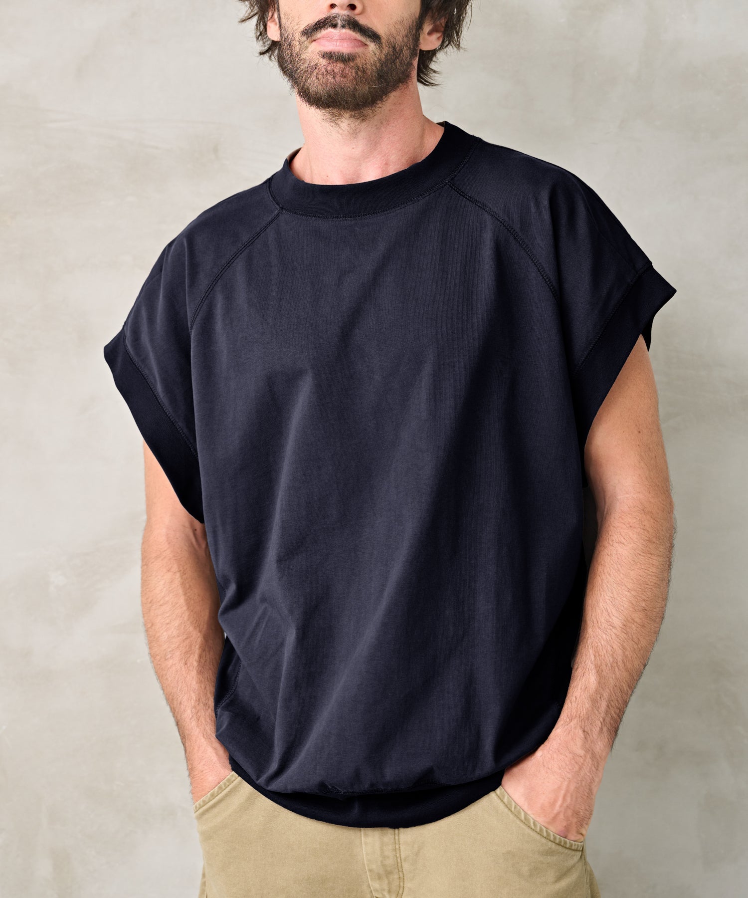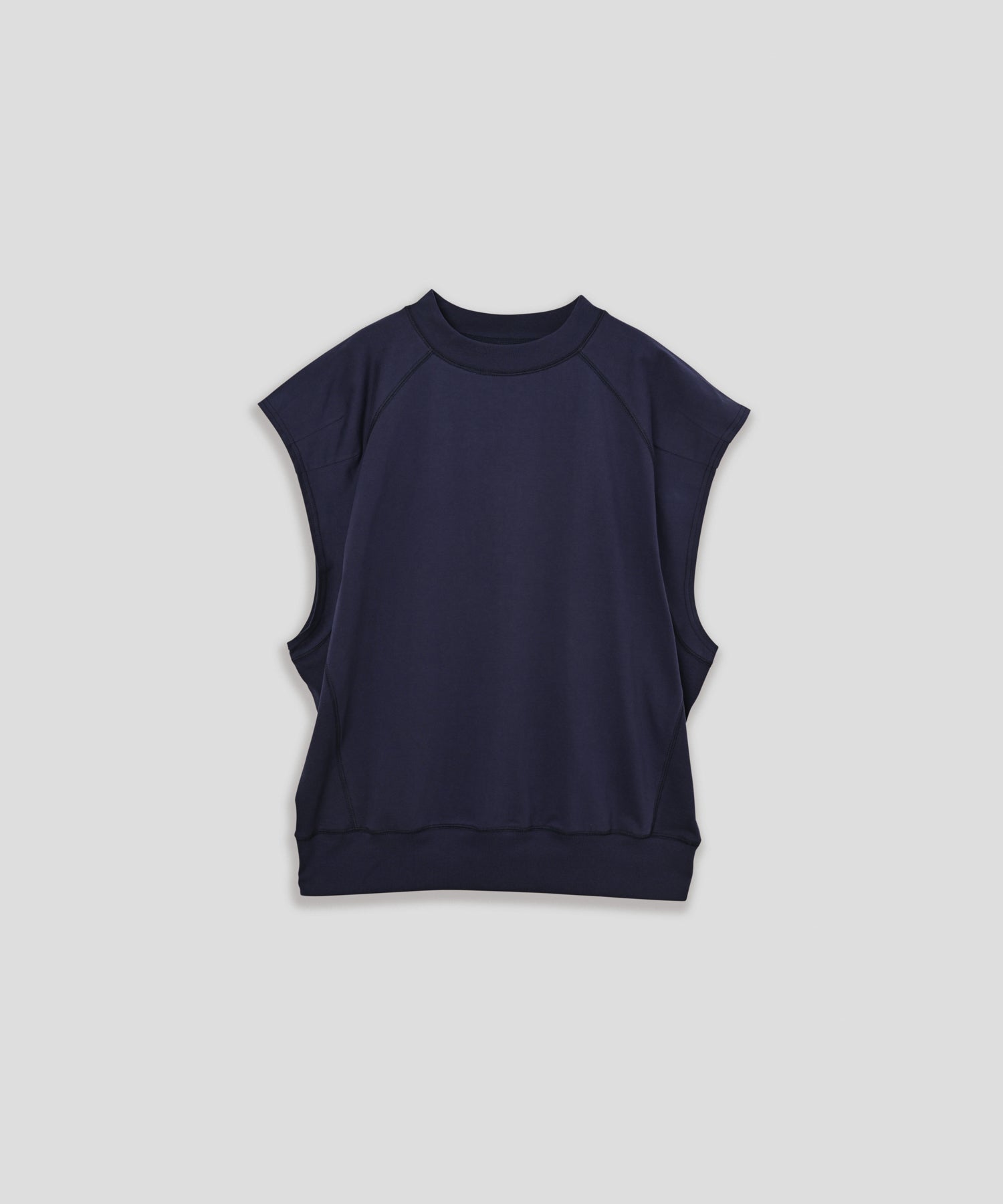 独特なシルエットでしたてたノースリーブトップス。