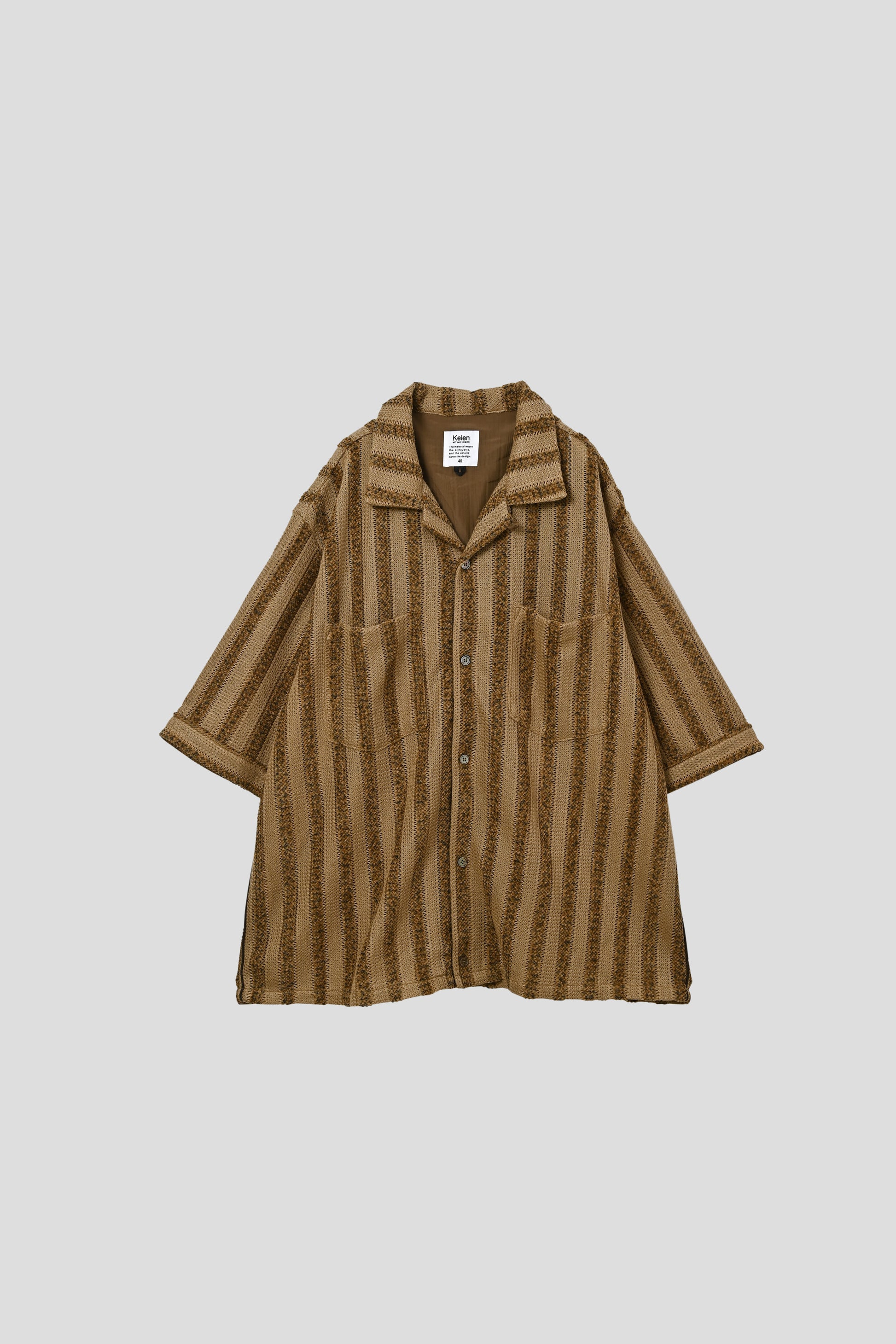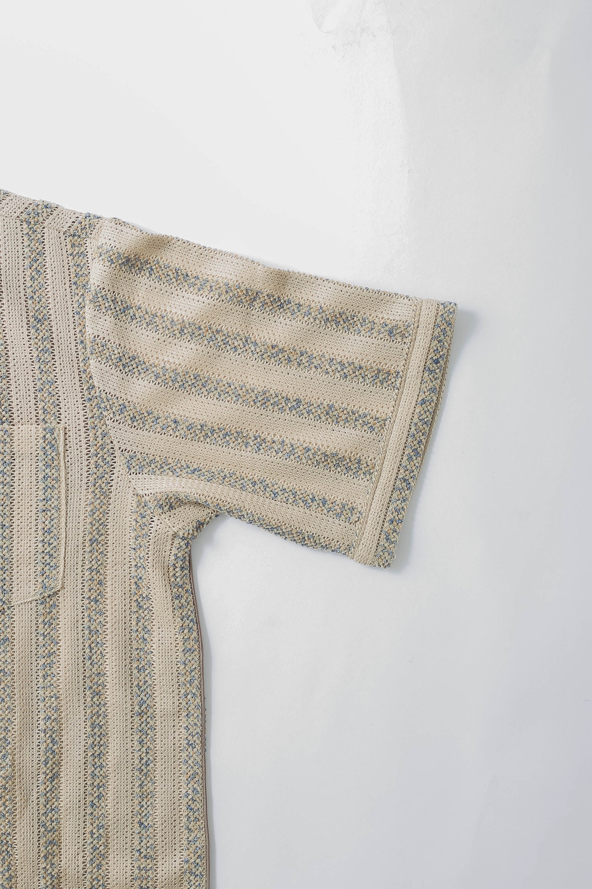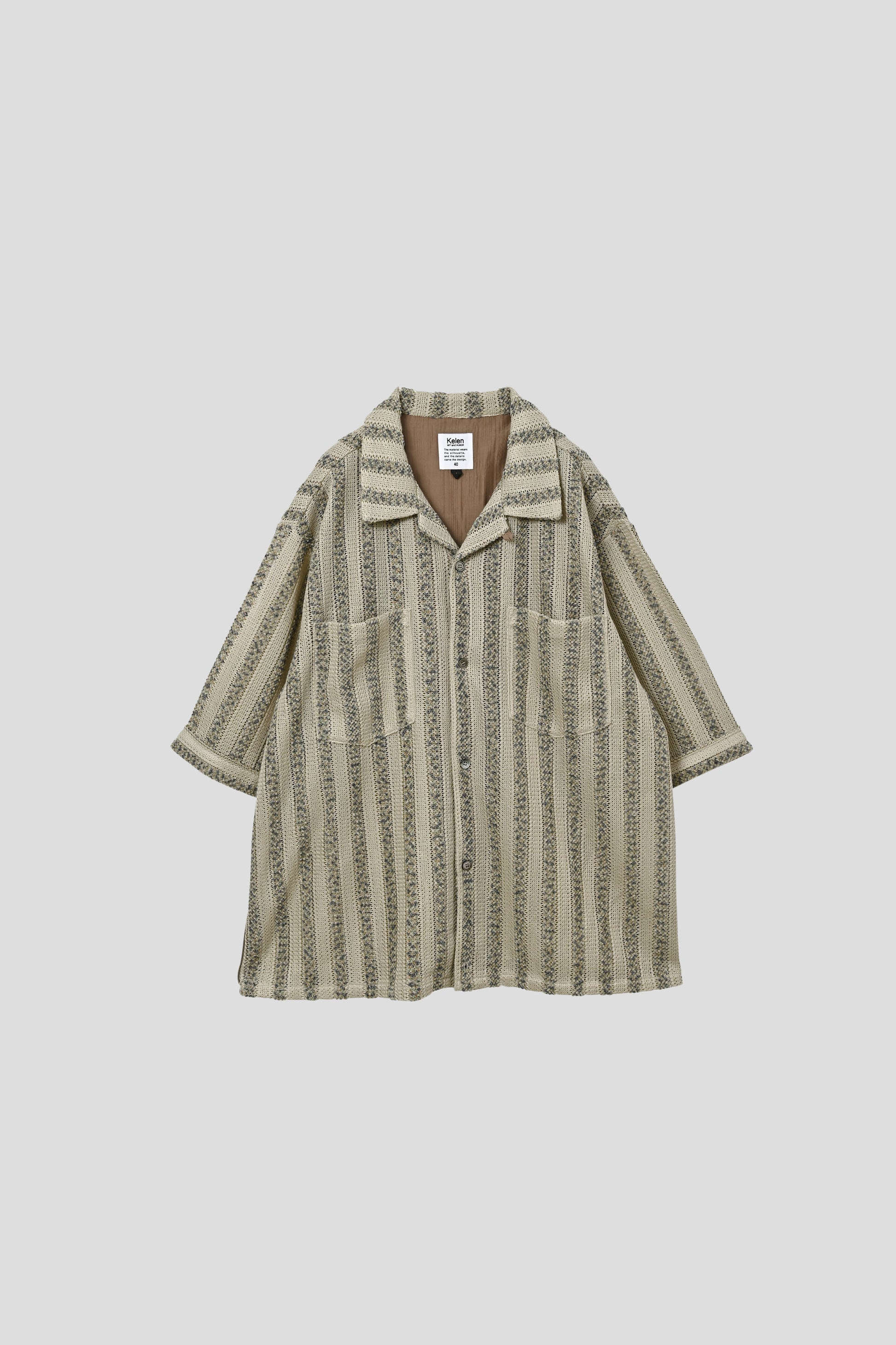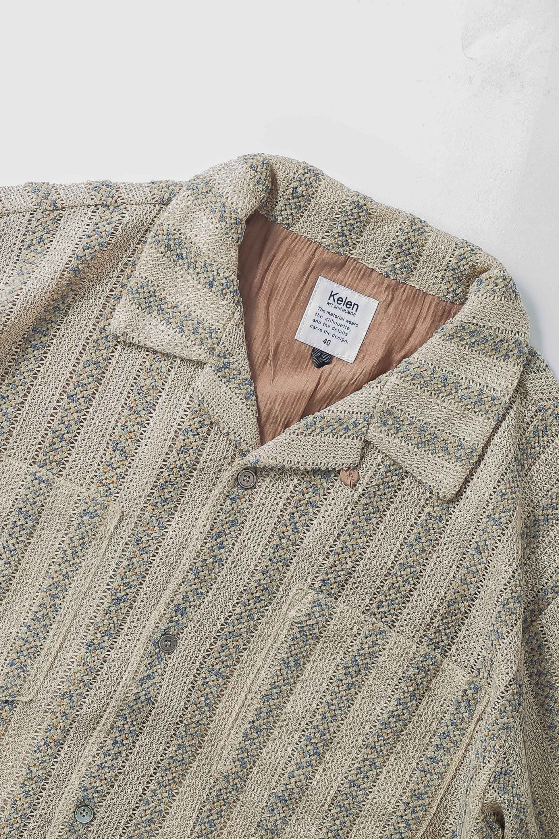 甘織りのストライプ調に織ったメッシュとレースが特徴的なファブリックを使用した開襟シャツ。