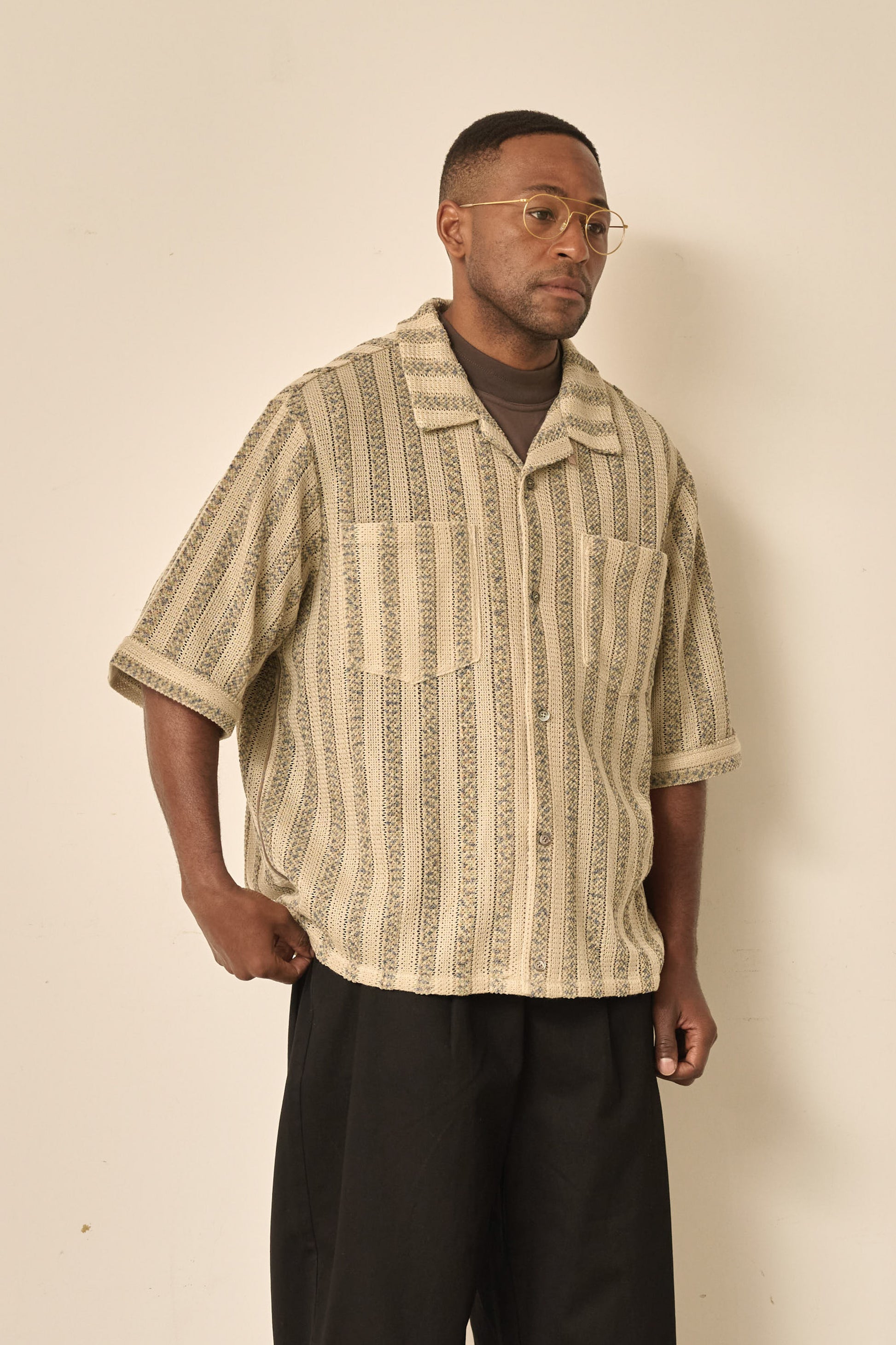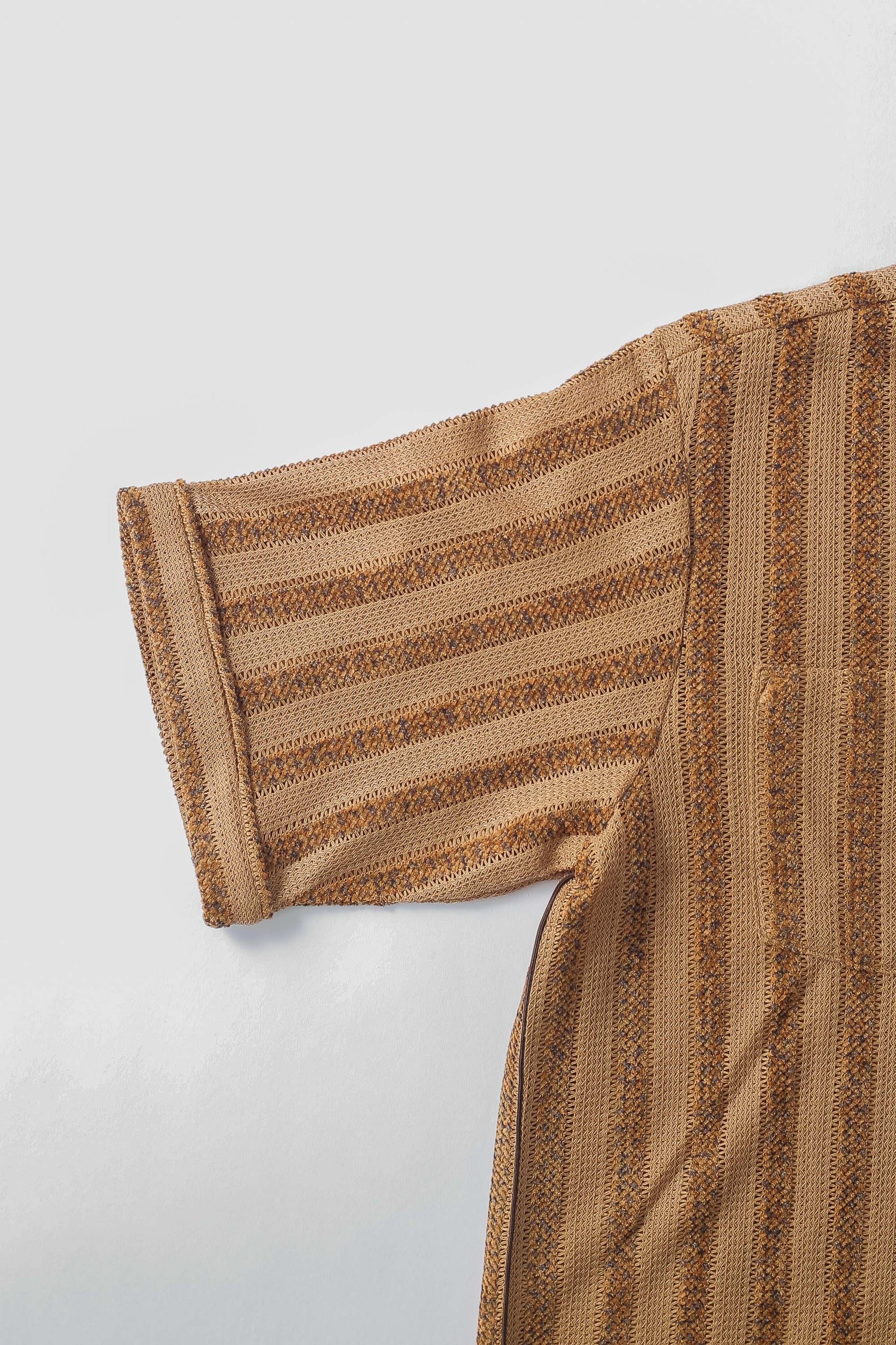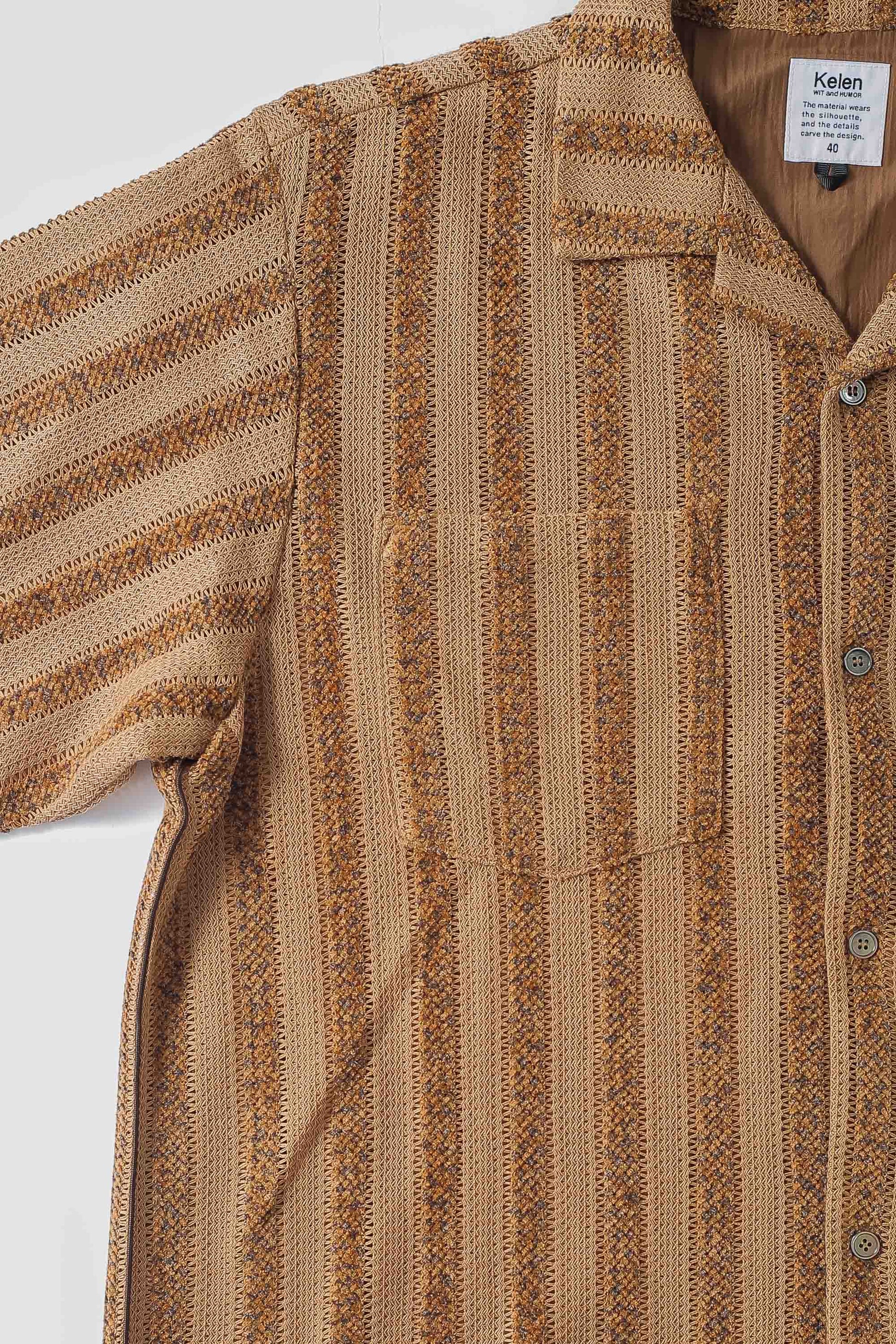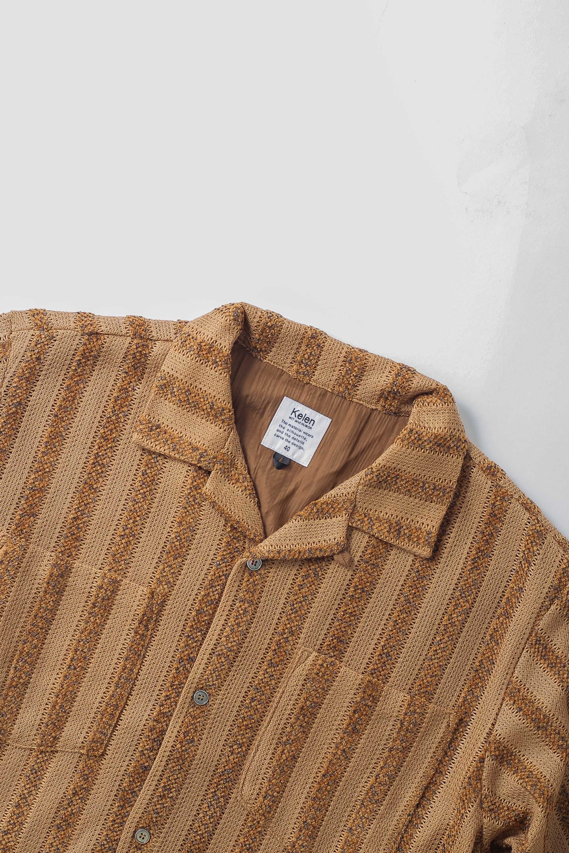 甘織りのストライプ調に織ったメッシュとレースが特徴的なファブリックを使用した開襟シャツ。