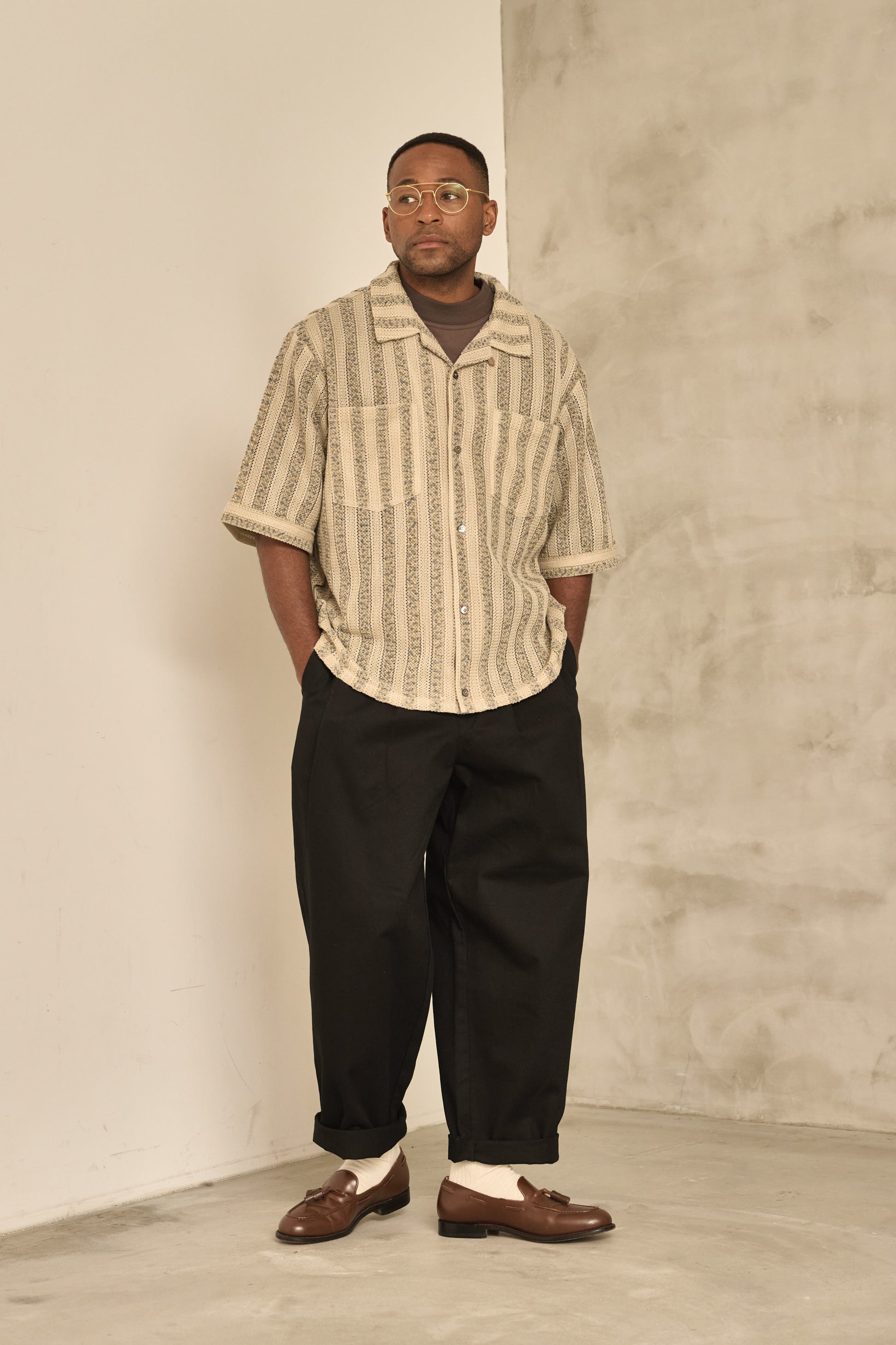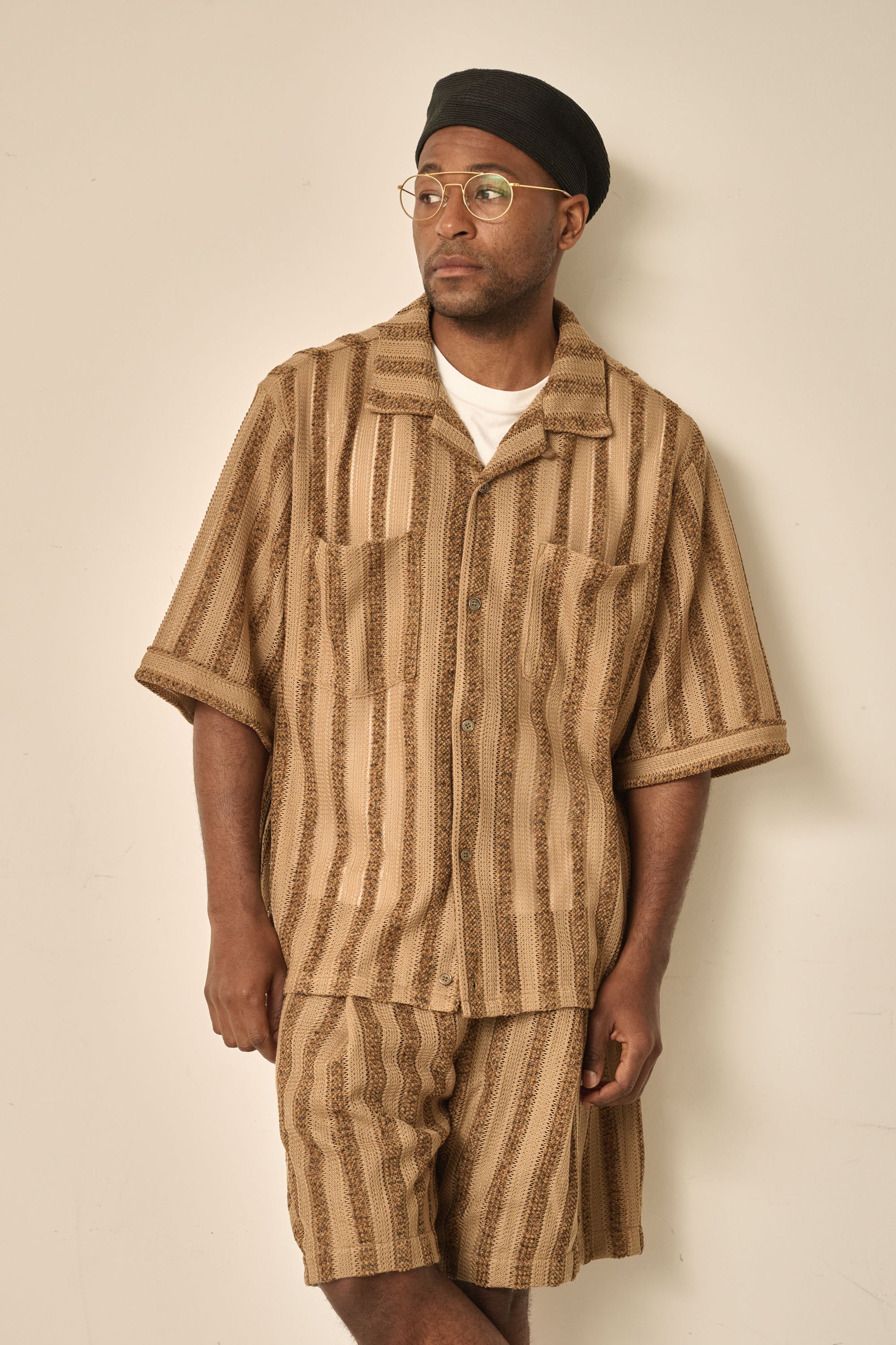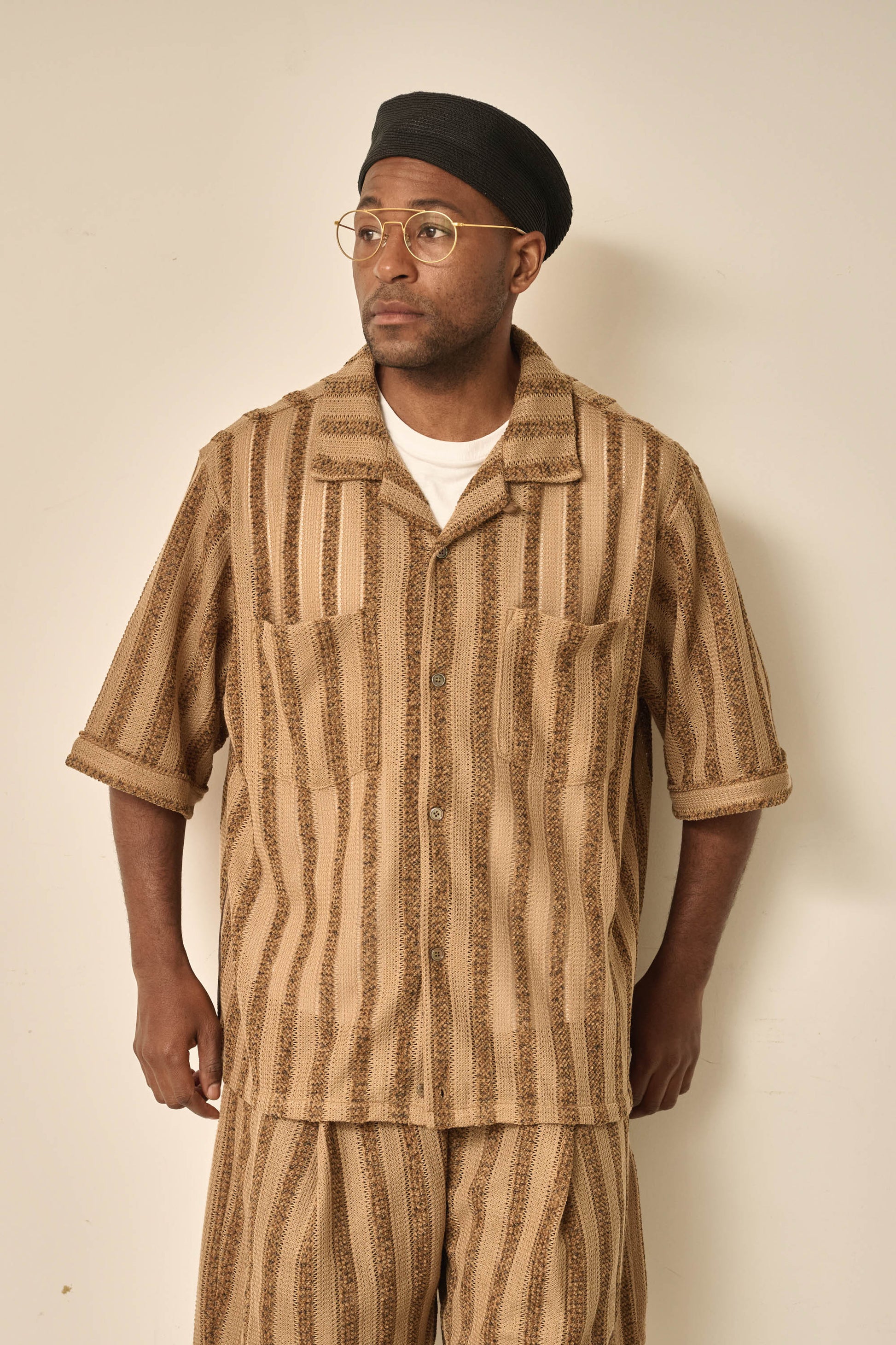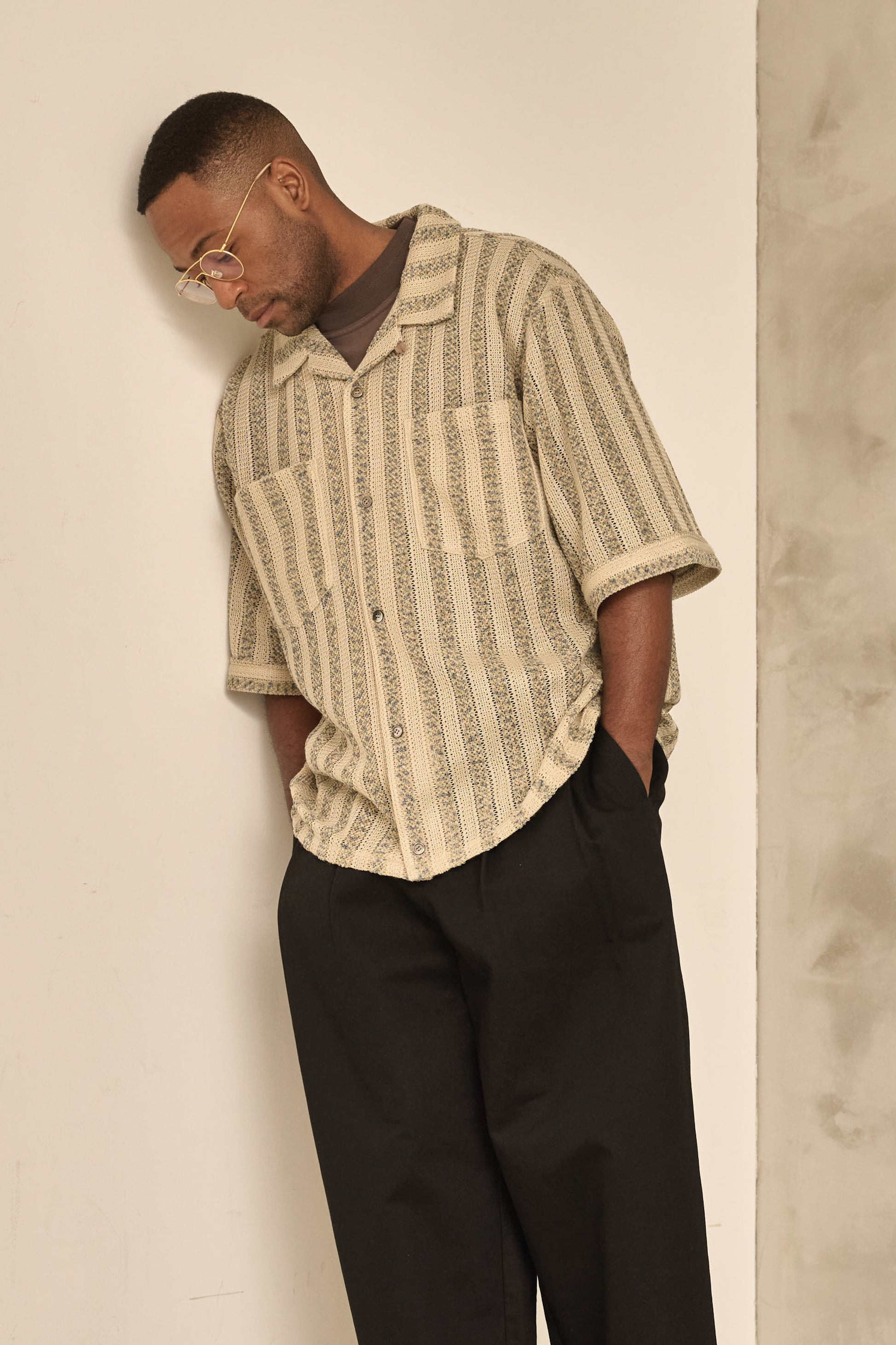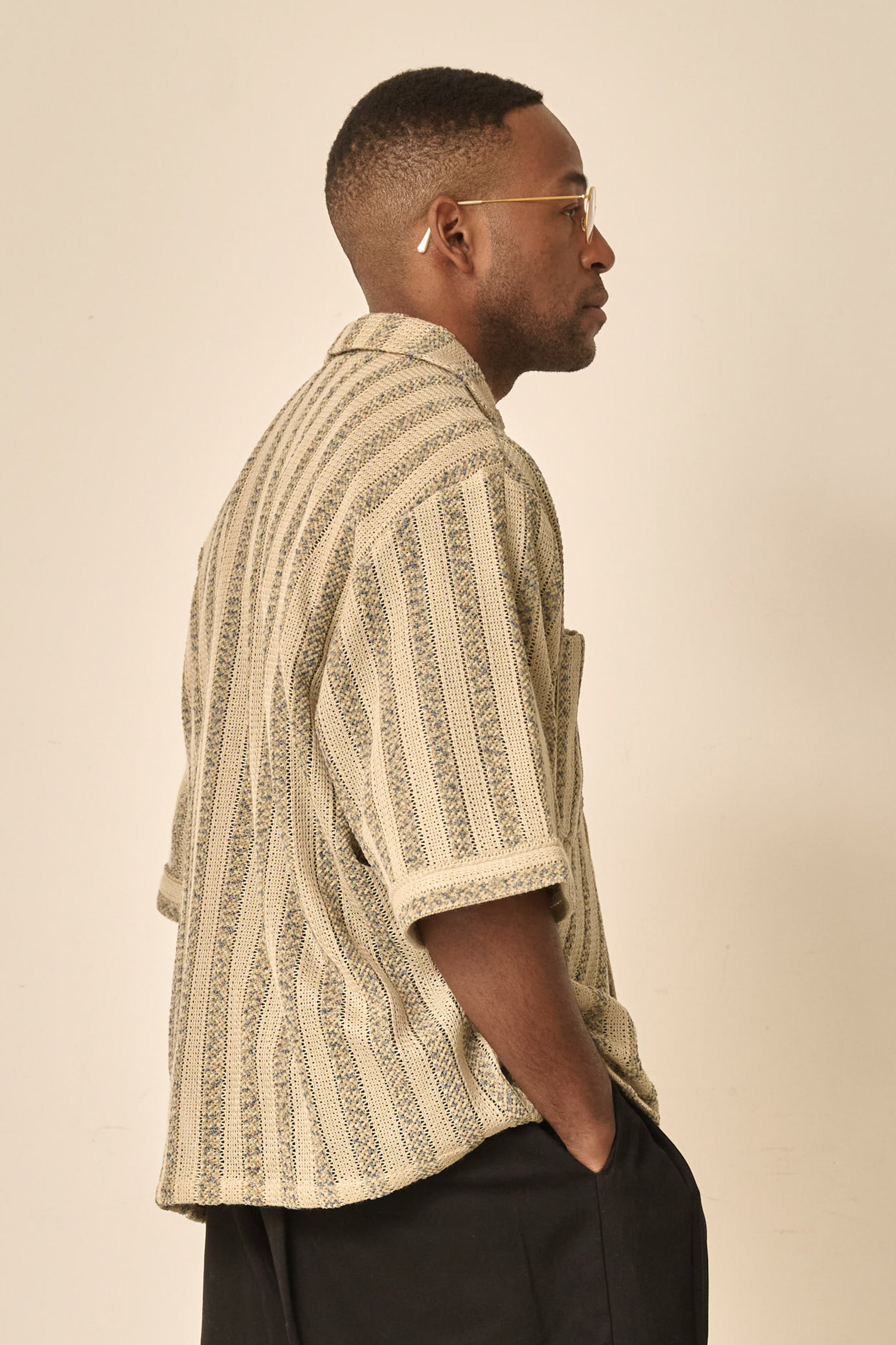 甘織りのストライプ調に織ったメッシュとレースが特徴的なファブリックを使用した開襟シャツ。