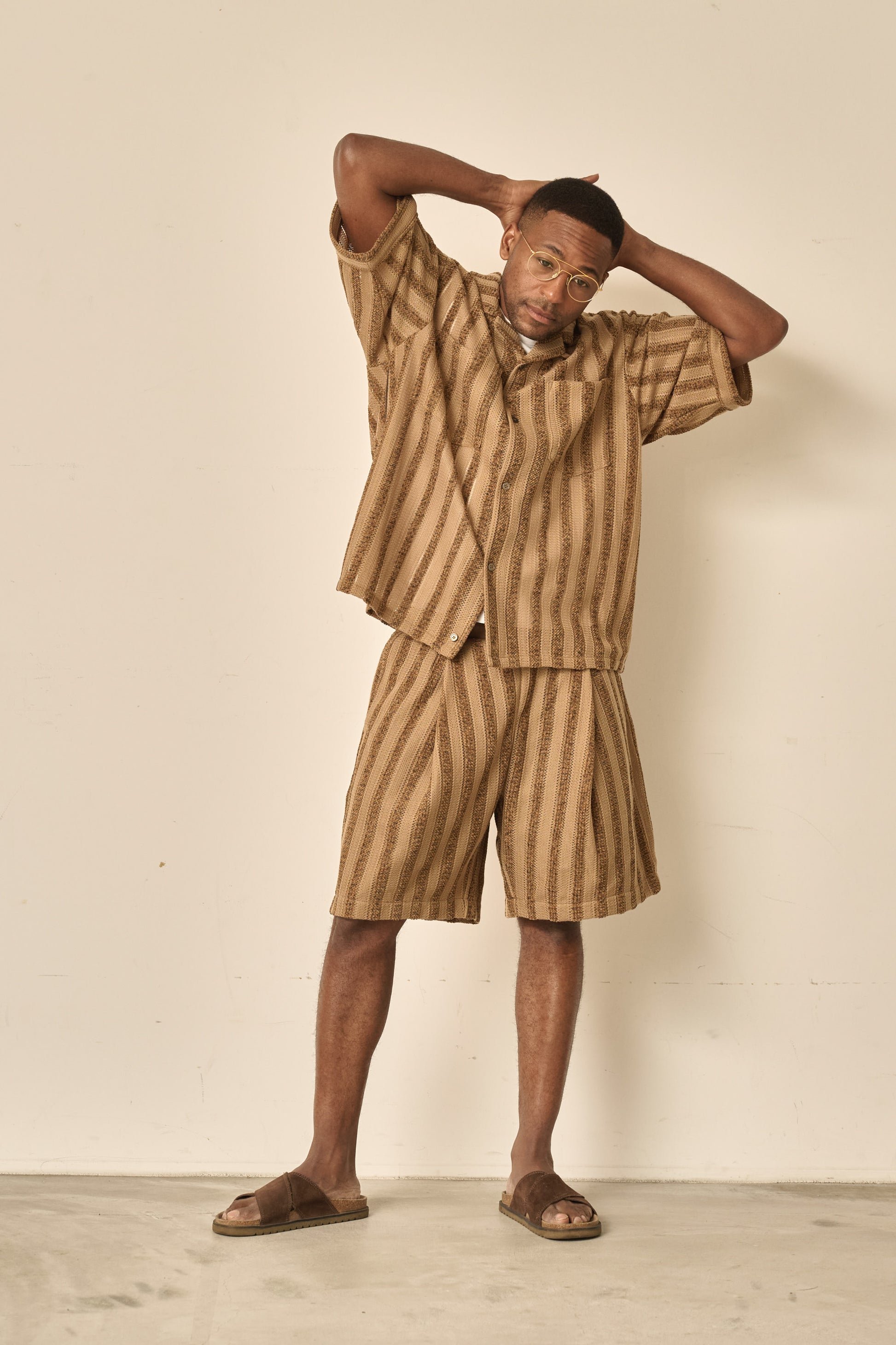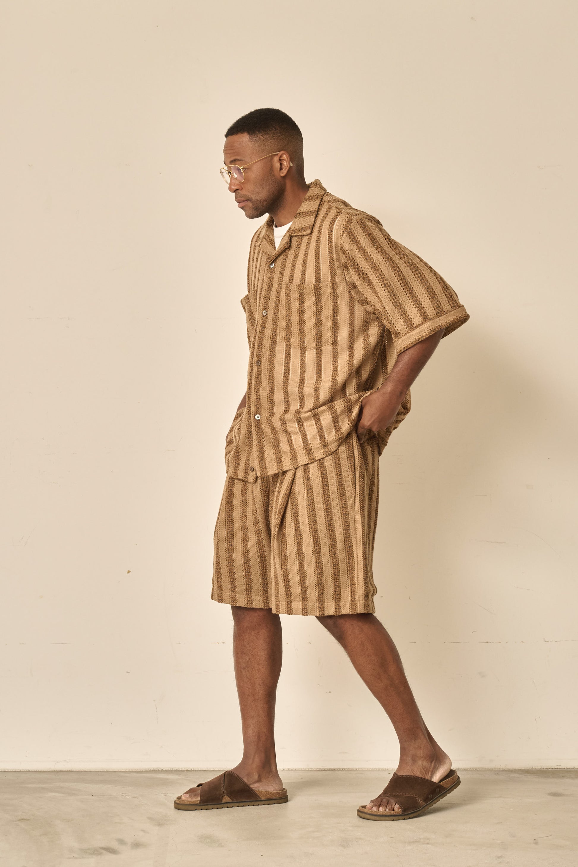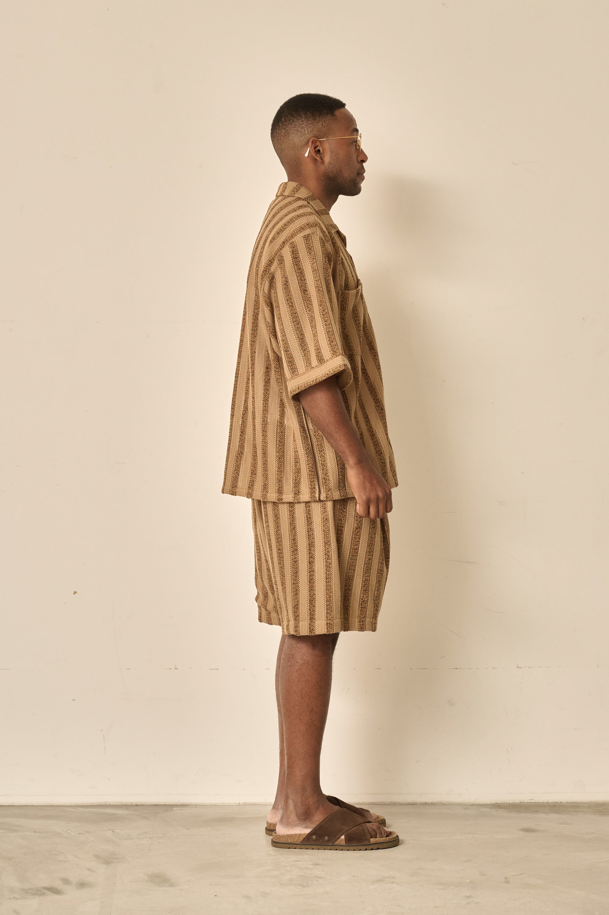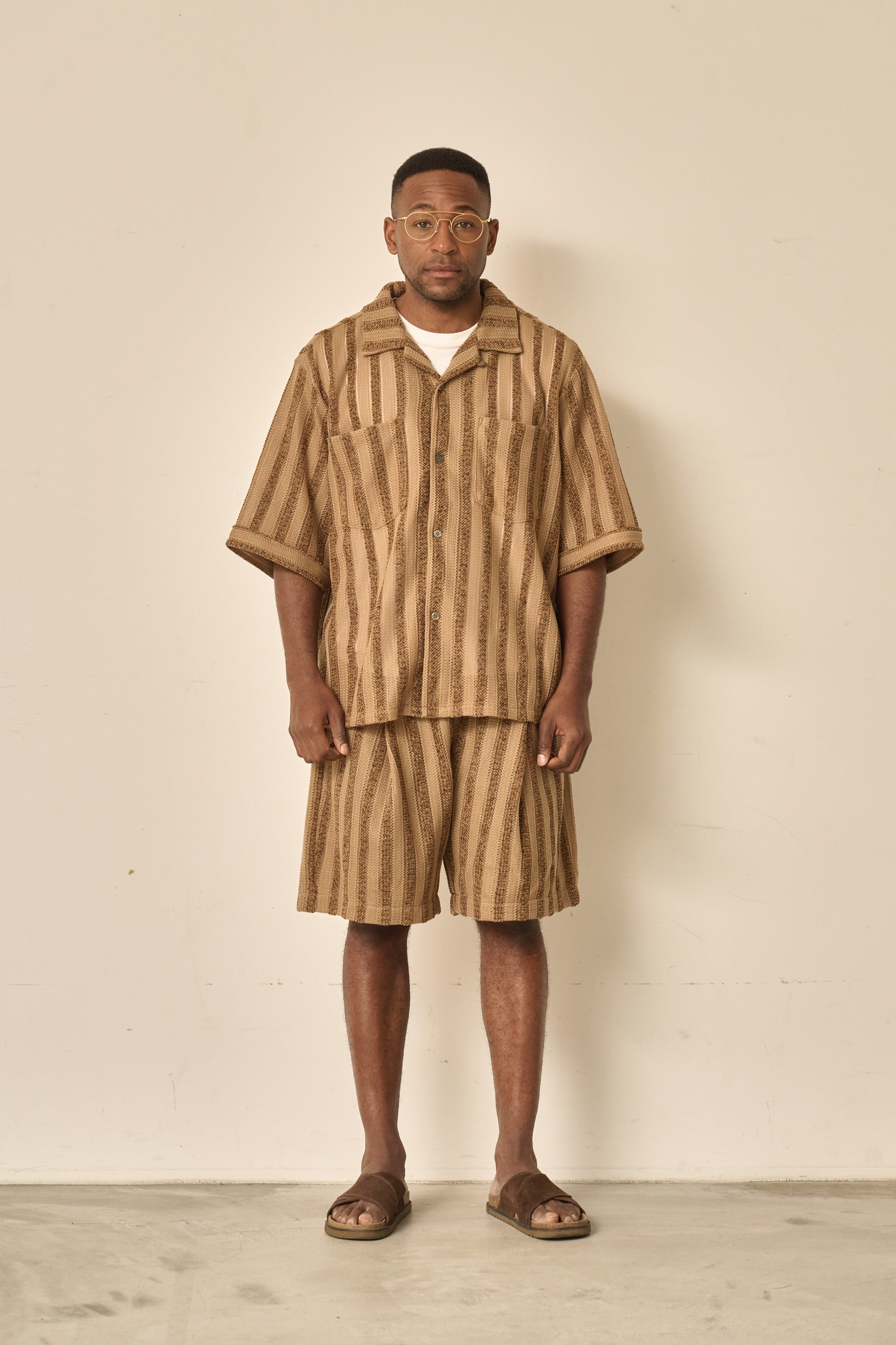 甘織りのストライプ調に織ったメッシュとレースが特徴的なファブリックを使用した開襟シャツ。
