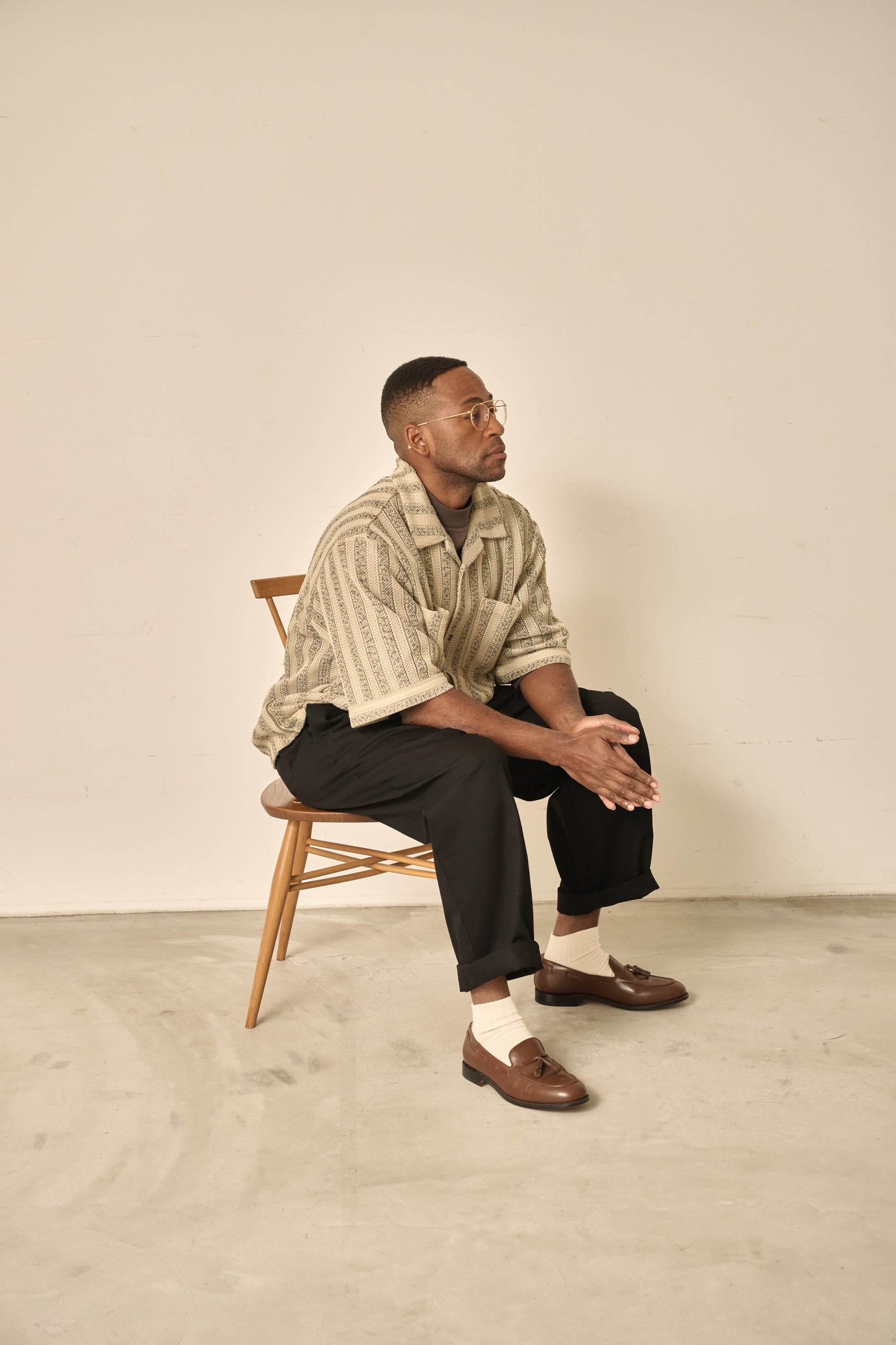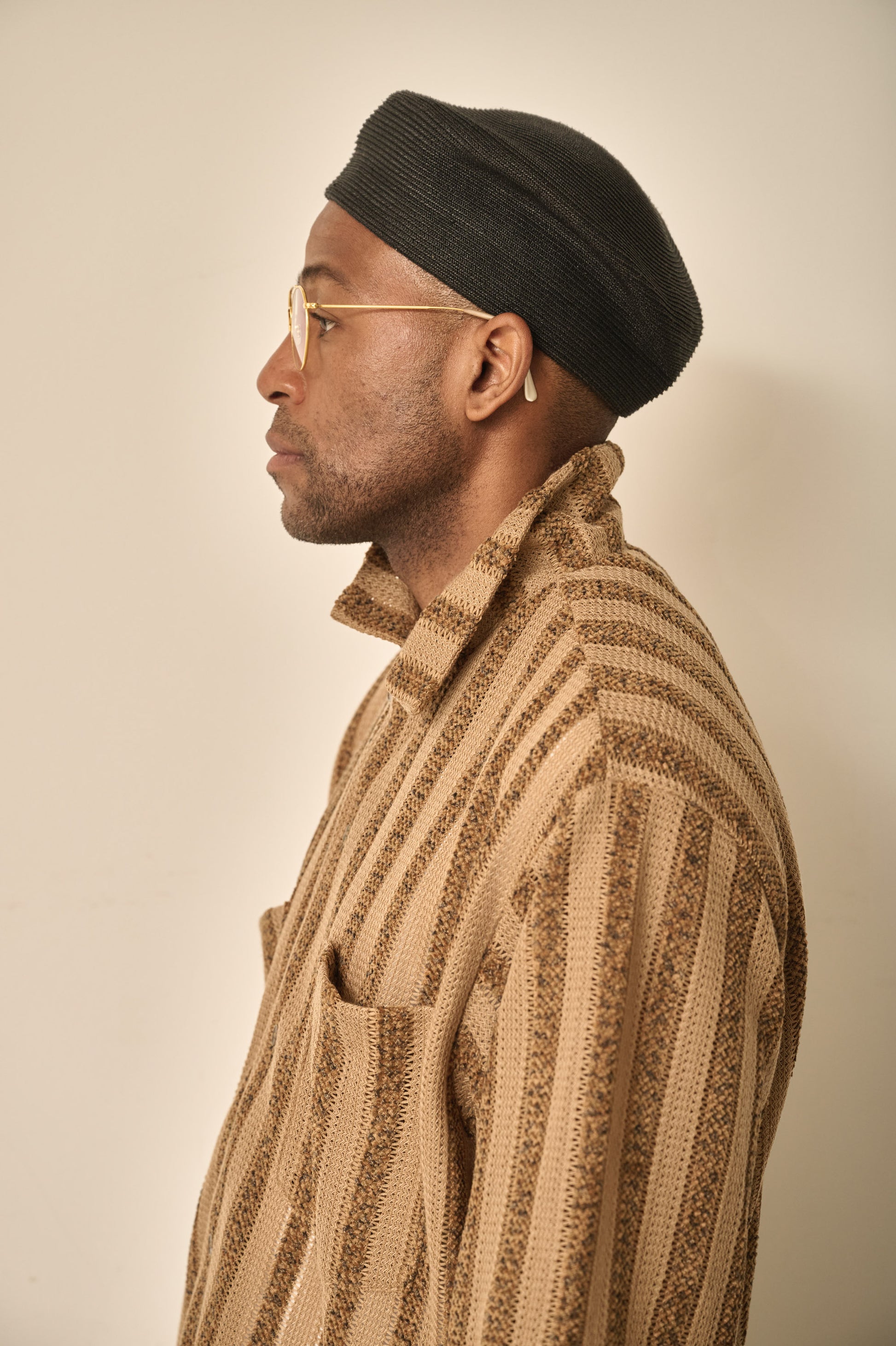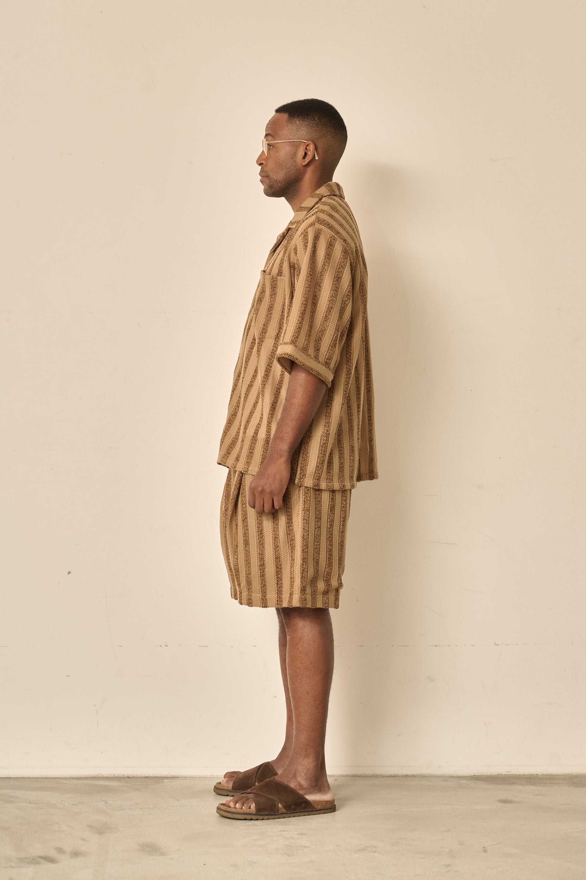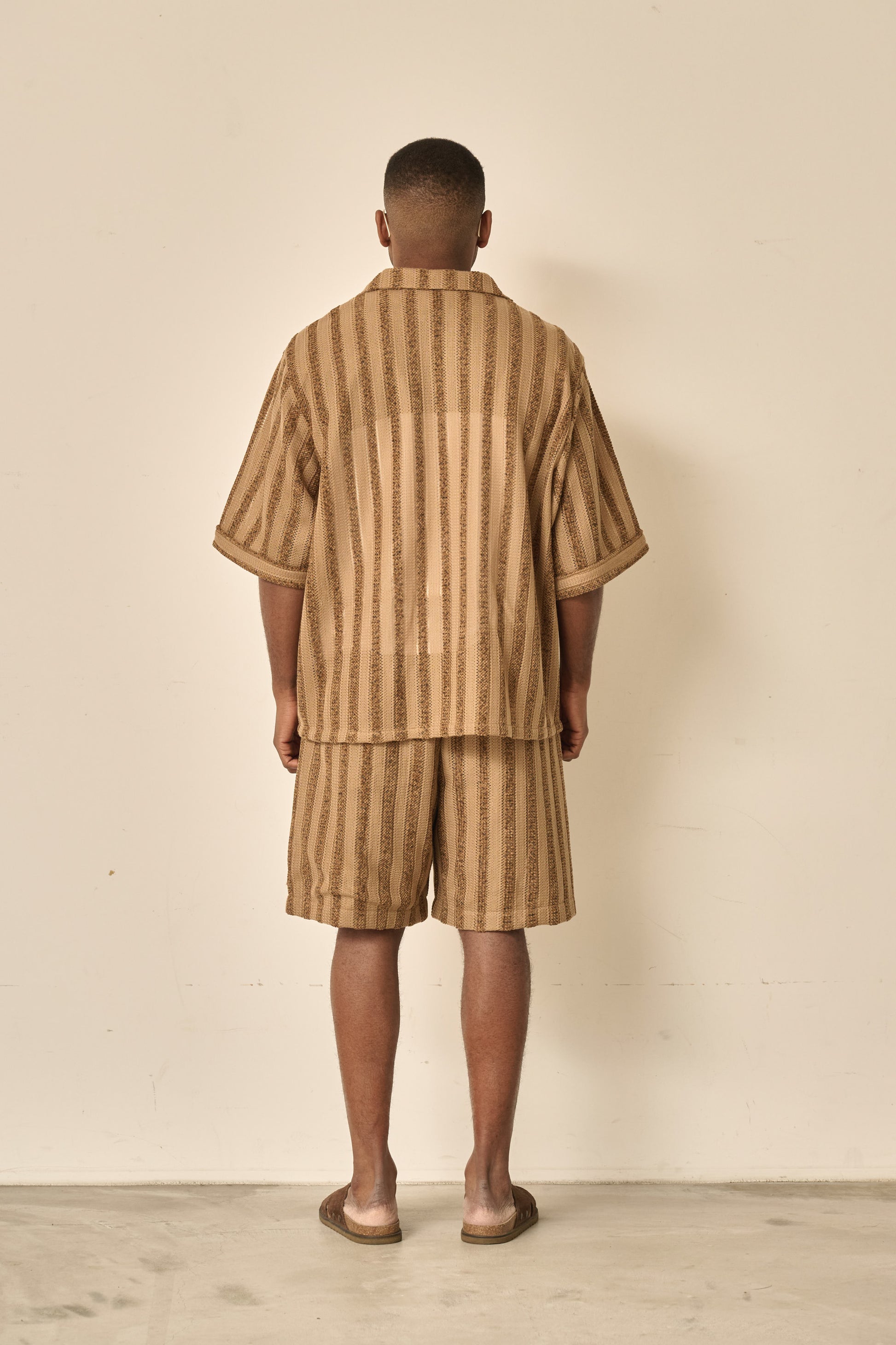 甘織りのストライプ調に織ったメッシュとレースが特徴的なファブリックを使用した開襟シャツ。